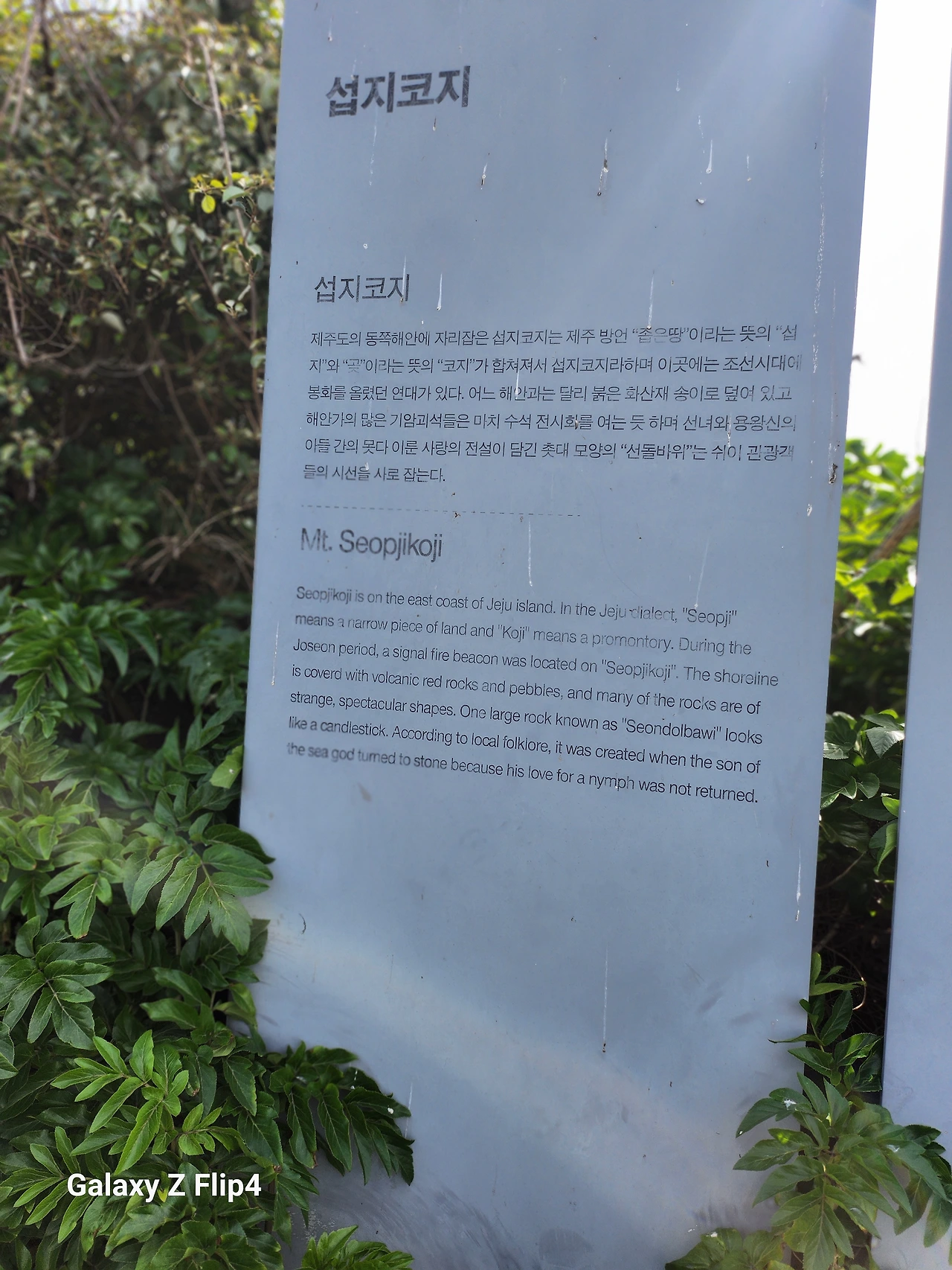 신양포구에 있는 섭지코지와 제주 평대리에 있는 비자림에 다녀오기로 했다. 그러면 아들 도착 시간에 맞추어 올 수 있는 스케줄이었다. 간단하게 누룽지탕을 후루룩 먹고 나섰다. 출발시간은 9시, 섭지코지는 제주도 방언으로 '좁은 땅'이란다. 붉은 화산재 송이로 덮여있었다. 선녀와 용왕신의 아들과의 못다 이룬 사랑이야기가 전해져 내려온다고 하였다. 일요일이라서인지 가족나들이객이 많았다. 다시 핸들을 돌려 30분쯤 달리니 제주 평대리의 '천연의 숲' 비자림에 도착했다. 주차장은 대만원이었다. 남편은 65세 이상이라 입장료가 무료였다. 좋다기보다 서글프다고 하였다. 피톤치드 가득한 오솔길을 걸으니 나도 모르게 콧구멍 평수를 넓히게 되었다. 숲의 향기가 너무나 신선하고 진했다. 가까운 동네에서 살며 매일 오고 싶다는 생각이 들었다. 무심코 걷다가 스르륵 지나는 뱀을 보고 나도 모르게 숲이 떠나가라 소리를 질렀다. 이 세상에서 제일 보기 싫은 것이 뱀이다. 주위 사람들이 놀라는 나를 보고 또 크게 웃었다. 남편은 저 멀리 사진 찍느라 보이지도 않고 하필 뱀, 벌 조심이라는 표지판 앞이었다. 나는 놀란 마음에 사진이고 뭣이고 겁이 나서 마구 내려왔다. 숙소에 오니 2시였다. 곧 도착한 아들내외랑 가까운 혼인지에 다시 들렀다가 갈치조림 맛집식당으로 향했다. 돌문어조림, 갈치조림, 옥돔구이를 주문하고 보니 집밥 솜씨였다. 너무 맛있었다. 점심을 굶은 우리는 밑반찬까지 남김없이 싹 빈 그릇으로 만들었다. 아들이 계산을 했다. 빨리 돈 모아서 집사야지 하며 우리가 계산하려니 굳이 아들이 계산을 했다. 다시 분위기 좋은 바닷가 찻집으로 가서 오랜만에 우리 넷은 이야기를 나누었다.