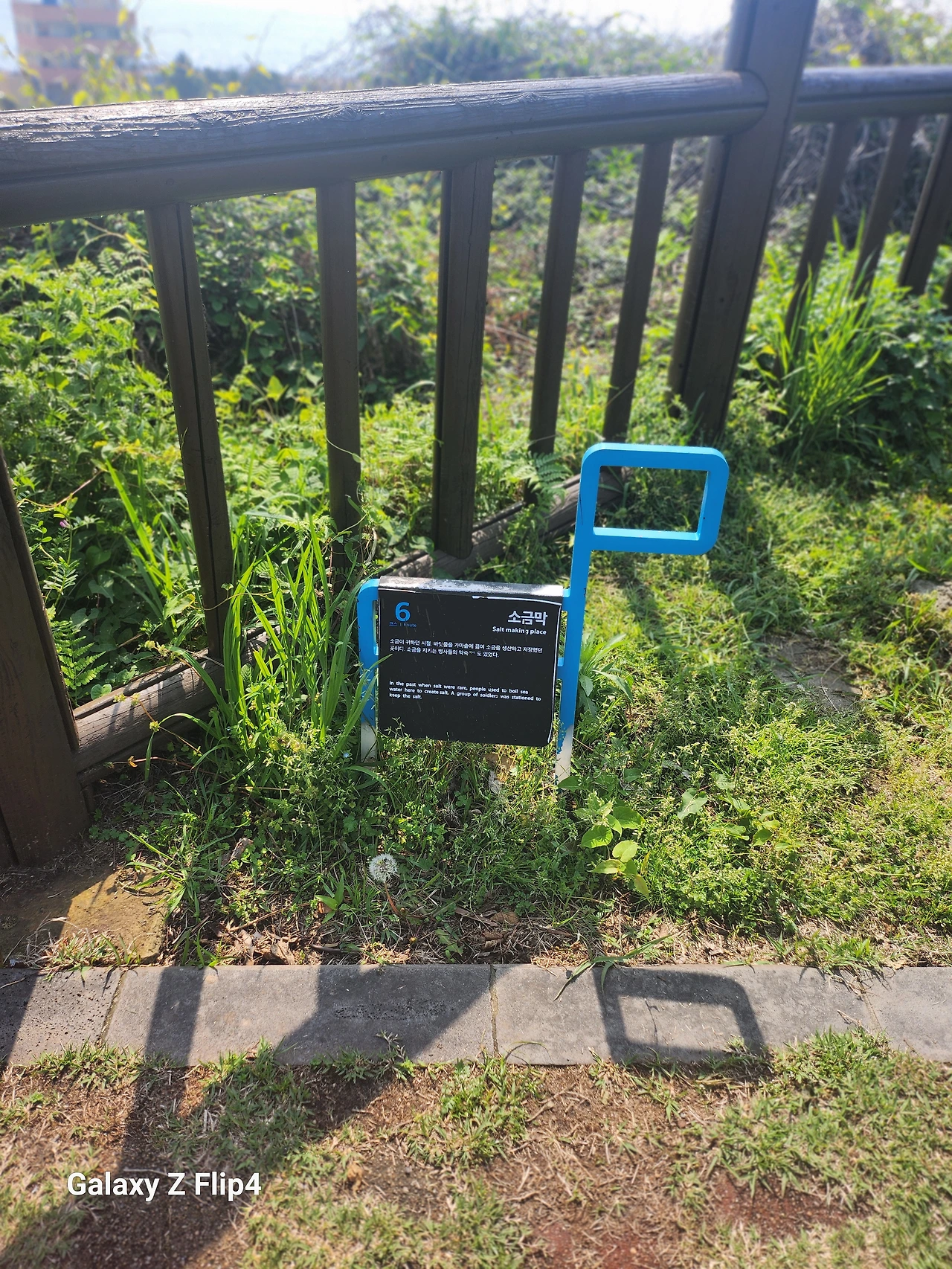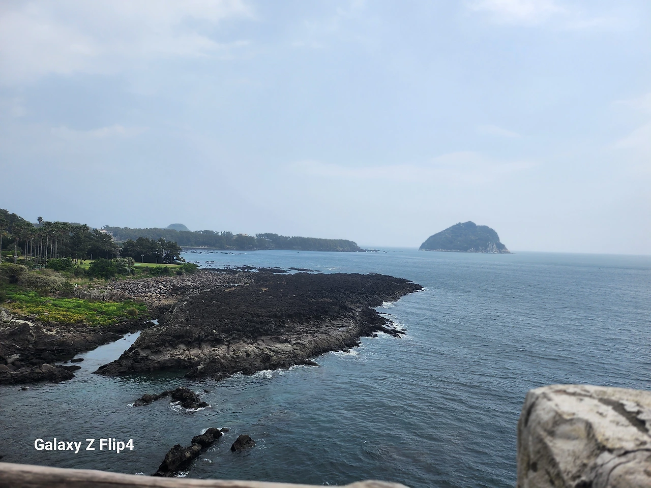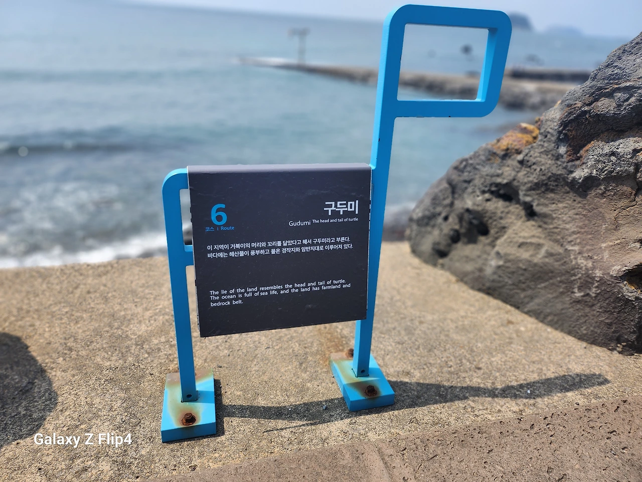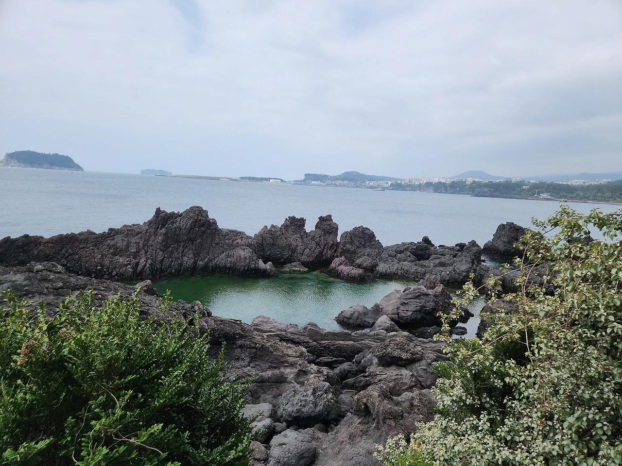 오늘 아침에도 우리 차로 출발지 소깍쇠까지 거의 50분을 달려 주차하게 되었다. 공영주차장은 무료였다. 조금 걷다 보니 소금막으로 쓰이던 장소가 나타났다. 소금이 귀하던 시절 바닷물을 끌여들여 가마솥에 끓여 소금을 만들던 곳이라고 했다. 곳곳에 기이한 바위 모양을 따라 이름을 부르고 거기에 얽힌 이야기가 많았다. 보목포구와 구두미 포구 해안길을 지나니 특히 6코스에서 기억에 남는 소천지라는 곳이 있었다. 백두산 천지모양과 같아서 이름을 그렇게 부른다고 하였는데 실제 백두산 천지못을 구경한 적이 있는 나는 감회가 새로웠다. 소천지 주변 기암괴석들은 그야말로 기이함을 떠나 자연의 현상에 신비로움을 더해주는 장관이었다. 저 멀리로는 섬들이 보였다. 아무래도 무인도 같았다. 섶섬, 보목포구가 장관을 이룬다.