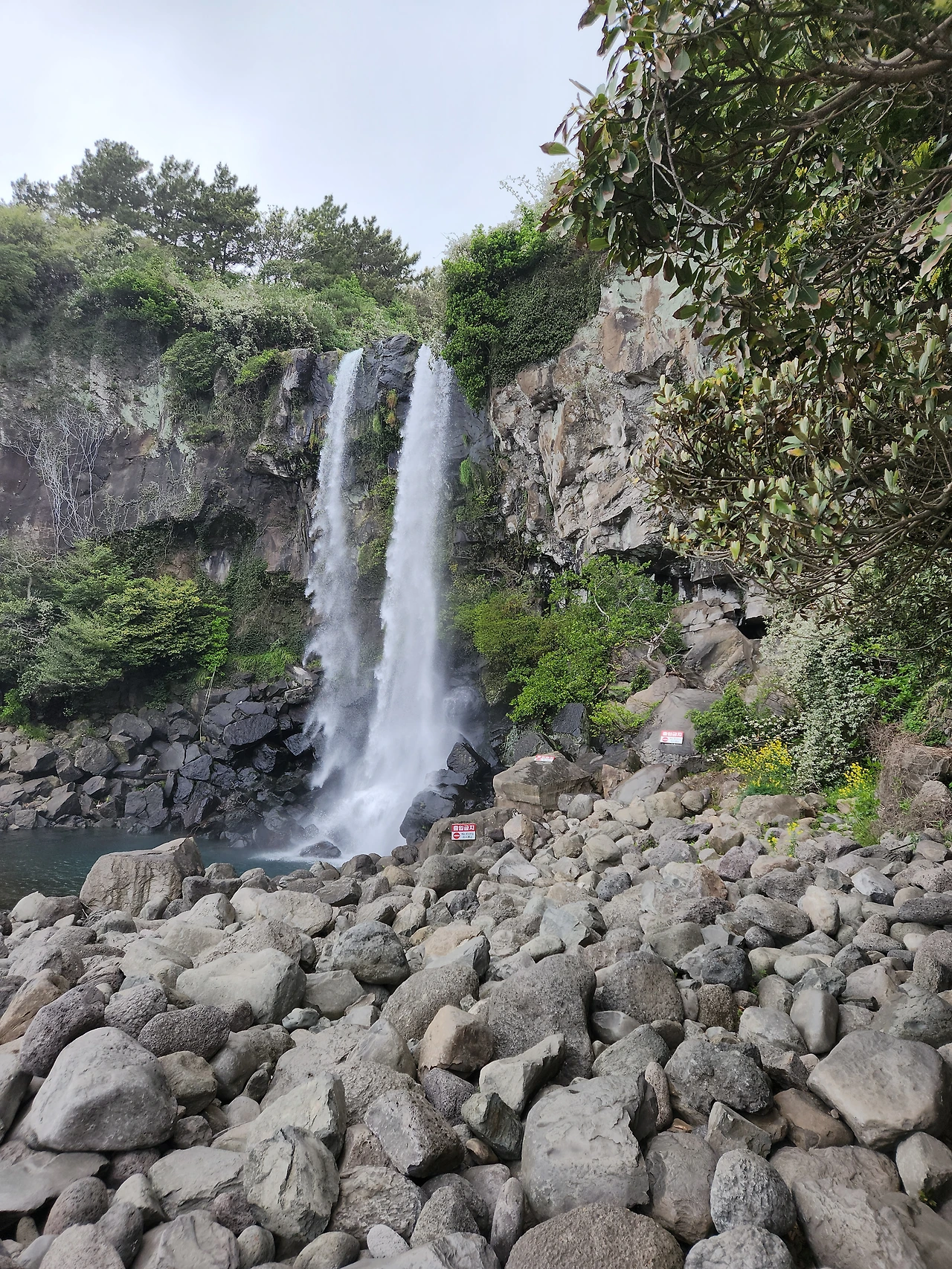 다시 숲터널을 지나오니 소정방폭포가 나타났다. 겁이 많은 나는 위에서만 보고 올라갔다. 백중날에 물맞이로 사용하였다고 하나 위험해 보였다. 이윽고 언덕을 올라와 소라의 성에서 중간인증 스탬프를 찍었다. 남영호 위령탑을 지나니 드디어 정방폭포가 나타났다. 매표를 하고 아래로 내려가니 사람들이 너무 많아서 한참을 구경하다가 사진을 찍었다. 폭포수가 수직절벽에서 바로 바다로 떨어지는 동양 유일한 폭포라고 하였다.