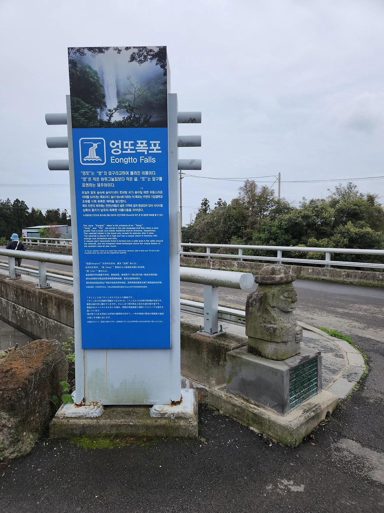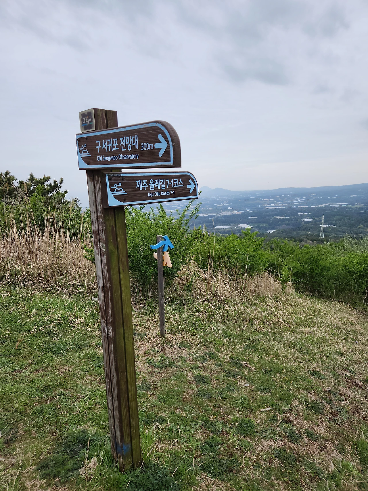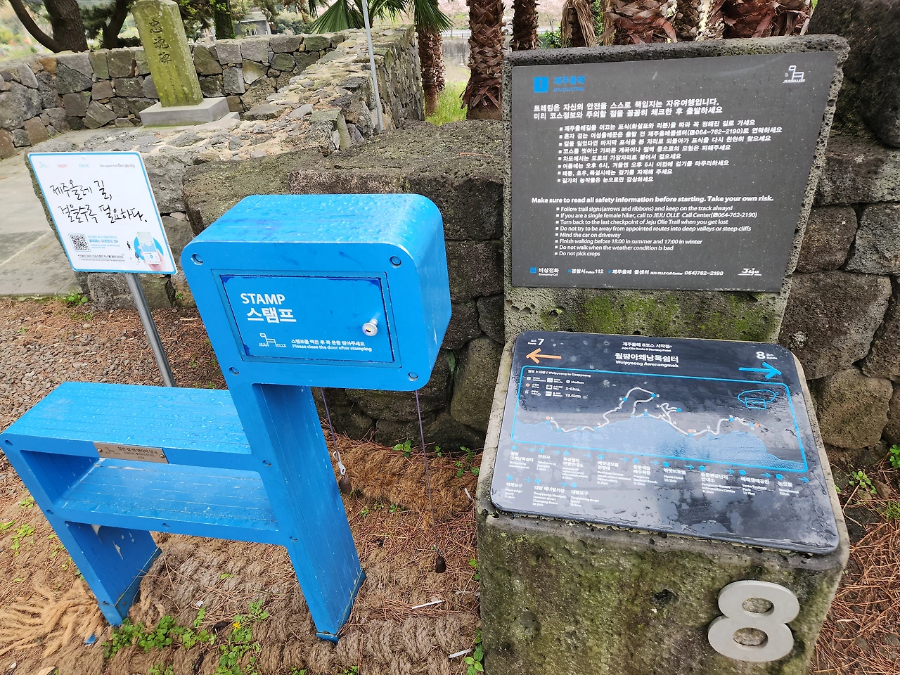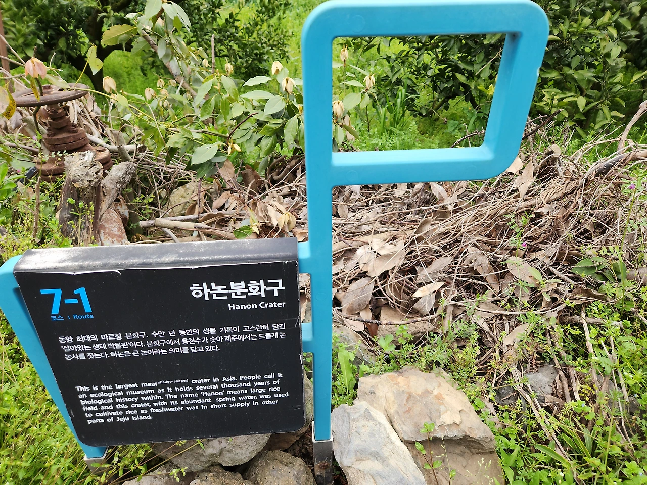 4월 11일 목요일 제주살이 11일 차, 오늘 아침 6시경부터 또 이슬비가 오는 제주 성산읍 날씨다. 이제는 제주 날씨에 적응이 되었다. 햇빛이 쨍쨍 내리쬐는 날씨보다 오히려 이런 날씨가 얼굴도 덜 타고 나은 편이다. 어제 마무리 못한 7코스를 다 걷고 7-1코스를 걷기로 했으나 나는 반대했다. 우리 몸이 젊은 사람들과 달라서 혹시나 무리해서 관절이나 다른 곳에 탈이 날까 봐 걱정된다면서 오늘 7-1 코스만 걷자고 했더니 남편도 걱정이 되는지 흔쾌히 그러자고 했다. 총거리가 13. 5킬로이고 우리 걸음으로 넉넉잡아 5시간이 걸릴 것 같았다. 우리 차로 숙소에서 50 여분을 달려 서귀포시에 자리 잡은 걸매생태공원에 주차를 하고 버스를 기다리다 시간이 너무 늦어서 택시를 타고 시작점인 서귀포버스터미널에 도착했다. 시작스탬프를 찍고 간식으로 또 곡물빵을 사서 넣었다. 여유를 즐기며 걷자고 했으나 숙소에서 가고 오는 데 걸리는 시간을 계산해 보면 그럴만한 여유가 없었다. 엉또폭포를 향하는데 시내를 통과하는 출발시점부터 언덕배기였다. 둘러맨 가방 때문에 어깨가 아프고 고관절도 삐걱거리기 시작했으나 참고 걸었다. 남편이 내게 물었다. 지금 엉또폭포에 물이 흘러내릴까? 하고 말이다. 얼마 전에 가본 정방폭포와 천지연폭포에는 물이 철철 넘쳐흐르던데 싶기도 하고 묻는 의도가 반드시 있지 싶어서 대답을 안 했다. 일단 가보자고 하였다. 엉또폭포의 모습을 보니 그냥 물줄기라고는 하나 없는 바짝 마른 그냥 낭떠러지였다. 들어서는 입구를 둘러싼 엄청난 수목의 거대함에 놀랐고 개울이 바짝 말라있음에 또 놀랐다. 아하, 안내판을 보니 제주에 엄청난 비가 쏟아져야 엉또폭포가 흘러내린다고 하였다. 남편은 알고 있었다. 다시 내려와 바로 고근산 입구로 들어섰다. 잠깐 쉬어가자며 낡은 나무 의자에 앉아 준비한 곡물빵을 나누어 먹었다. 생수하고만 먹는 빵이 왜 그리 맛이 있던지 생각해 보니 숲에서 나오는 달고 단 무공해 공기의 영향과 두 노부부의 여유로움이 배가되지 않았나 싶다. 완전 계단으로 이루어진 정상에 오르니 산불감시 역할을 하는 정자 앞에 중간인증 스탬프가 기다리고 있었다. 스탬프를 찍고 보니 왼쪽으로 분화구가 있고 그 주변으로 산책로가 있어 한 바퀴 도니까 내려가는 길이 나왔다. 동네마다 게이트볼장이나 파크골프장이 있었으나 사람은 거의 보이지 않고 심지어 잡초가 무성하게 나 있었다. 가가호호 마당들이 대부분 넓은 편이고 정원이 정성껏 가꾸어져 있어서 지나는 길손들의 눈호강이 되어주었다. 호근마을을 지나고 나니 석불, 수정, 화석류, 목공예 등 엄청나게 귀한 작품들이 전시되어 있는 박물관이 나타났다. 몇백억 원의 가치를 지닌다는 설명을 들었으나 소시민 우리에게는 그냥 전시품일 뿐이었다. 박물관에서 파는 커피를 사서 마시고 내려오니 봉림사라는 절이 나왔다. 육지에서 흔히 보던 절의 모습을 처음 보았다. 걸음을 재촉하며 걷다 보니하논분화구가 나타났다. 제주에서 처음으로 마주친 논농사를 하는 동네였다. 마침 경운기로 논을 가는 모습을 보면서 안내를 보니 유일하게 물이 잘 안 빠져서 벼농사등 논농사를 짓는다고 하였다. 오늘은 바닷가 구경을 못한 코스였다. 다시 걸매생태공원을 빙빙 걸었다. 아주 깔끔하게 조성된 시내 공원이었다. 공원에서 좀 쉬다가 시내로 향해 최종목적지인 제주올레여행자센터에들렀다. 최종마침 스탬프를 찍고 다시 걸어서 우리 차를 세워둔 걸매생태공원에 도착했다. 시멘트길을 많이 걸은 오늘 코스가 다리에 무리를 많이 주는 것 같다. 가고 오는데 시간 손실이 많았다. 내일은 오후에 서울에서 딸이 외손주와 온다고 해서 장을 보고 오니 7시가 넘었다. 또 하루가 지나갔다. 세월아, 좀 천천히 가거라 싶다.