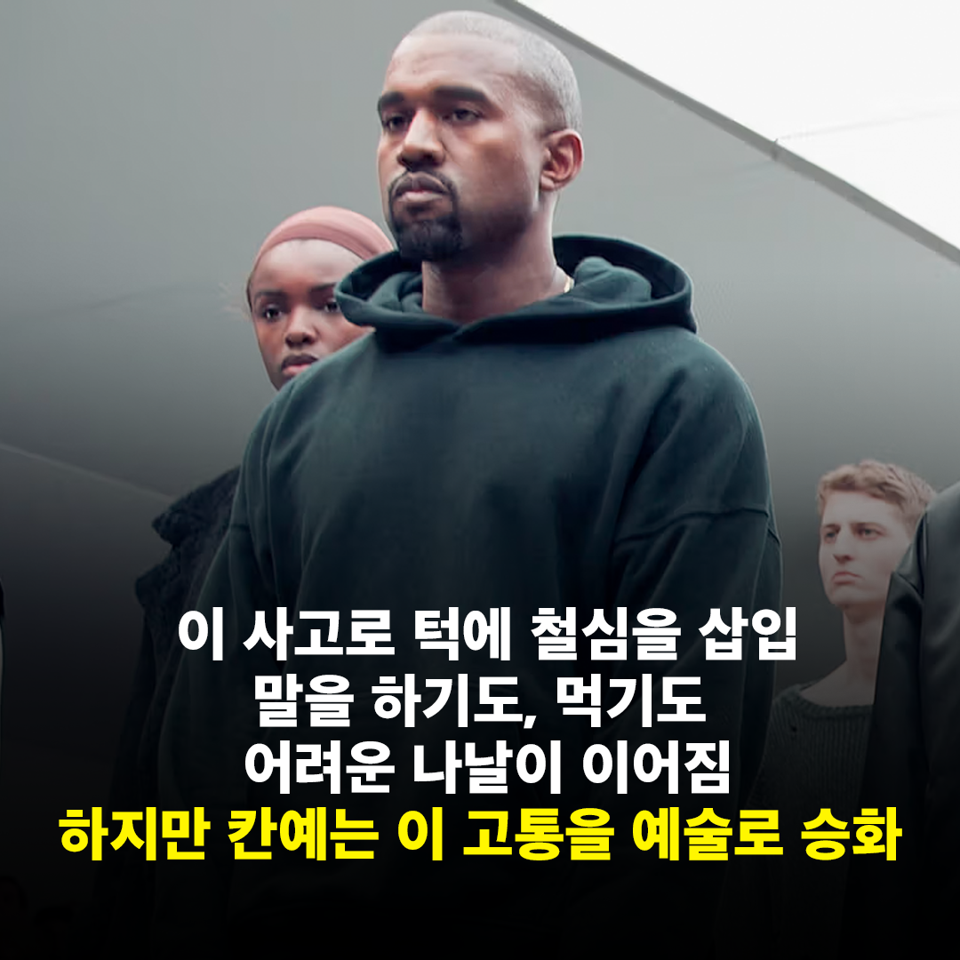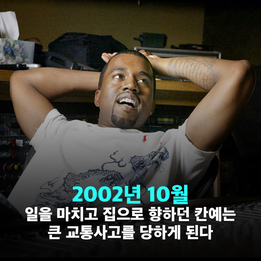 2002년 10월, 칸예는 불운한 교통사고를 당합니다. 스튜디오에서 작업을 마치고 돌아가던 중, 그가 타고 있던 차는 LA 한가운데에서 다른 차량과 충돌합니다. 이 사고는 그의 얼굴과 턱뼈에 심각한 부상을 남겼고, 의사들은 그의 턱을 고정하기 위해 철심을 삽입하는 수술을 진행하게 됩니다. 그는 이 수술로 턱이 완전히 닫힌 상태에서 회복을 시작해야 했고, 이 기간 동안 말을 하기도, 먹기도 어려운 나날이 이어졌습니다. 이런 상황에서 보통 사람들은 조용히 회복을 기다리며 쉬었을지도 모릅니다. 하지만 칸예는 다르게 생각했습니다. 이 고통과 절망을 음악으로 승화해보겠다는 생각이 그의 머릿속을 떠나지 않았습니다.