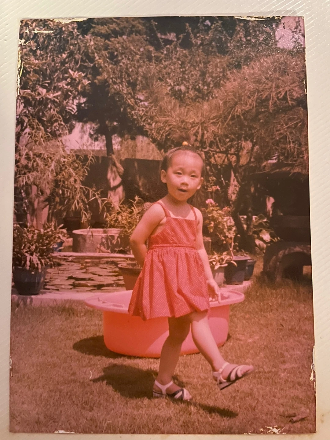 다음은 내가 3살 되던 해 여름, 두 손은 뒤로 모으고 우아한 자태로 할아버지에게로 걸어가는 사진이다. 한 껏 올려 묶은 똥머리를 한 나는 하얀색 점이 찍힌 빨간색 민소매 원피스를 입고, 에나멜 구두를 신은 채였다.