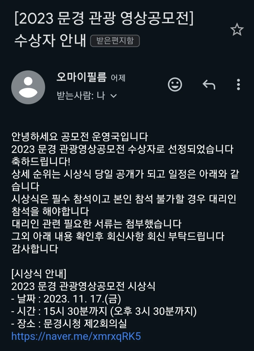 수상자 안내 메일아직 상세 순위는 나오지 않았지만, 예기치 못하게 수상을 받게 됐다. 주말에 문경을 방문하여 촬영을 하던 도중, 갑작스러운 소나기 탓에 비 맞은 생쥐꼴로 집에 돌아왔던 경험이 단순히 고생으로만 끝나지 않아서 다행이라는 생각이 들었다.