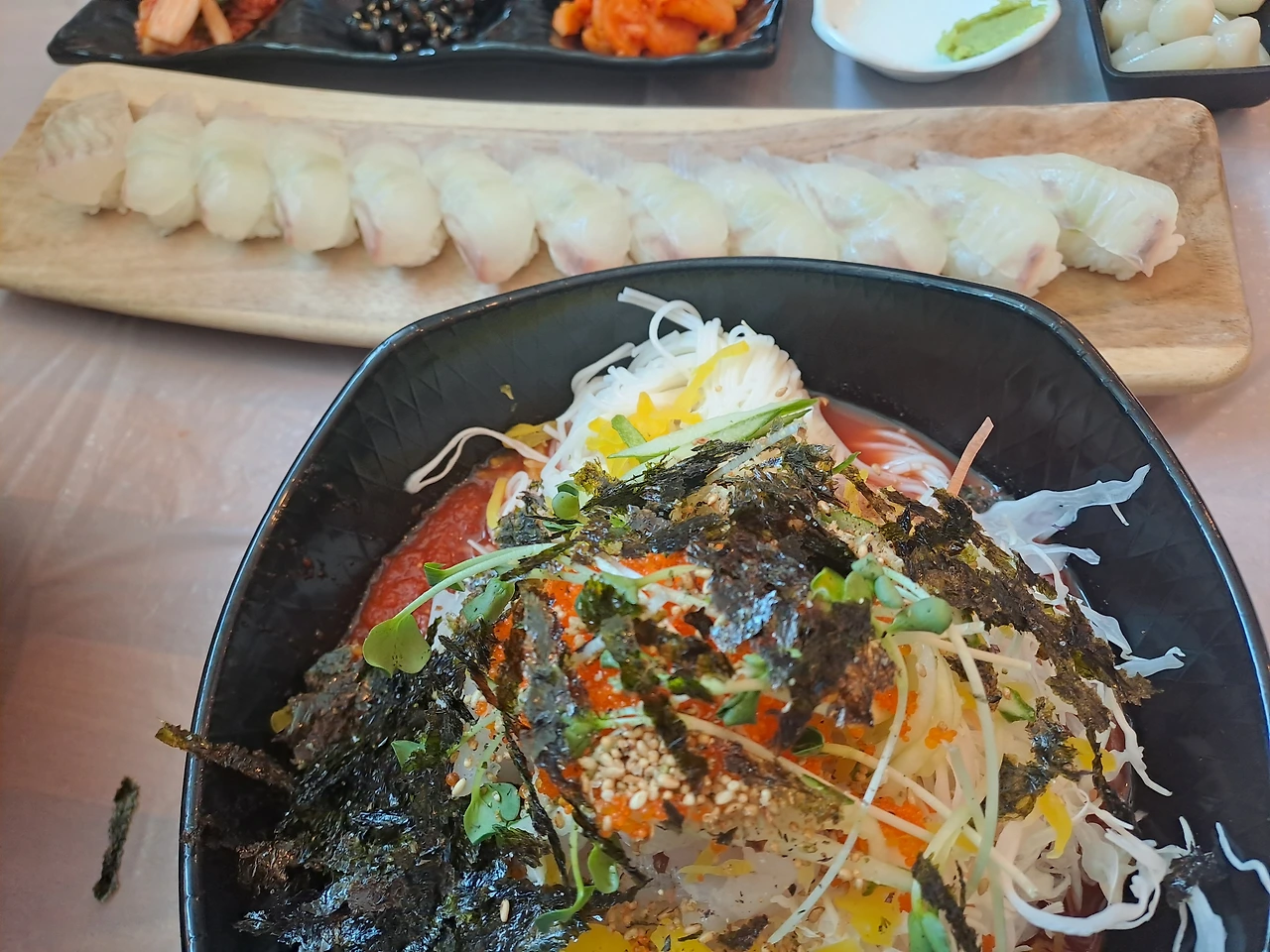 한 그릇 뚝딱하는 내내 회를 아끼지 않아도 한 젓가락에 한 점씩 평등하게 먹을 수 있으며 입가심으로 마지막 한입은 평범한 초밥은 숨 막히도록 좋다. 한 번도 덜하지 않아 배불리 먹고 대천을 잘 왔다 싶게 만드는 나의 맛집리스트 1호.