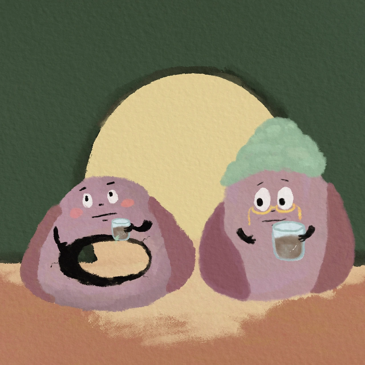 가을이라 그런지 밖은 쌀쌀했고 몸에 긴장이 들기 시작했다. 집에 들어가 낙엽 담요라도 들고 나오고 싶었지만 차마 아버지의 얼굴을 볼 수 없었기에 오들오들 떨고만 있었다. 그때, 등이 따뜻해지며 누군가 내 옆에 앉았다. 바로 엄마였다. 엄마는 작은 잔에 흙탕물을 따라주시고 본인은 큰 잔에 따라 마셨다.