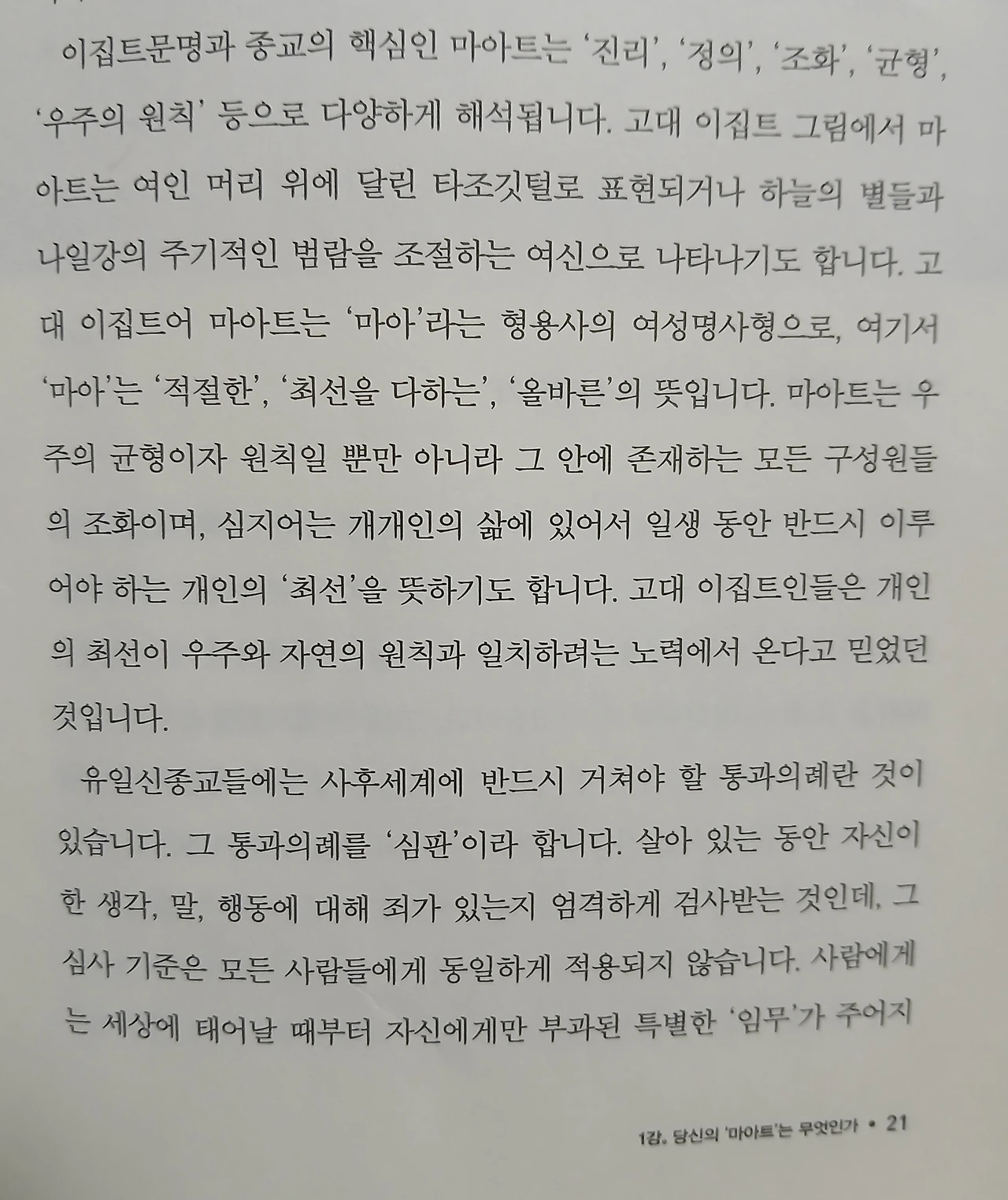 이 책을 읽기 전보다, 나는 나 자신의 마아트를 위해 더 굳건하게 서야겠다는 생각을 한다.