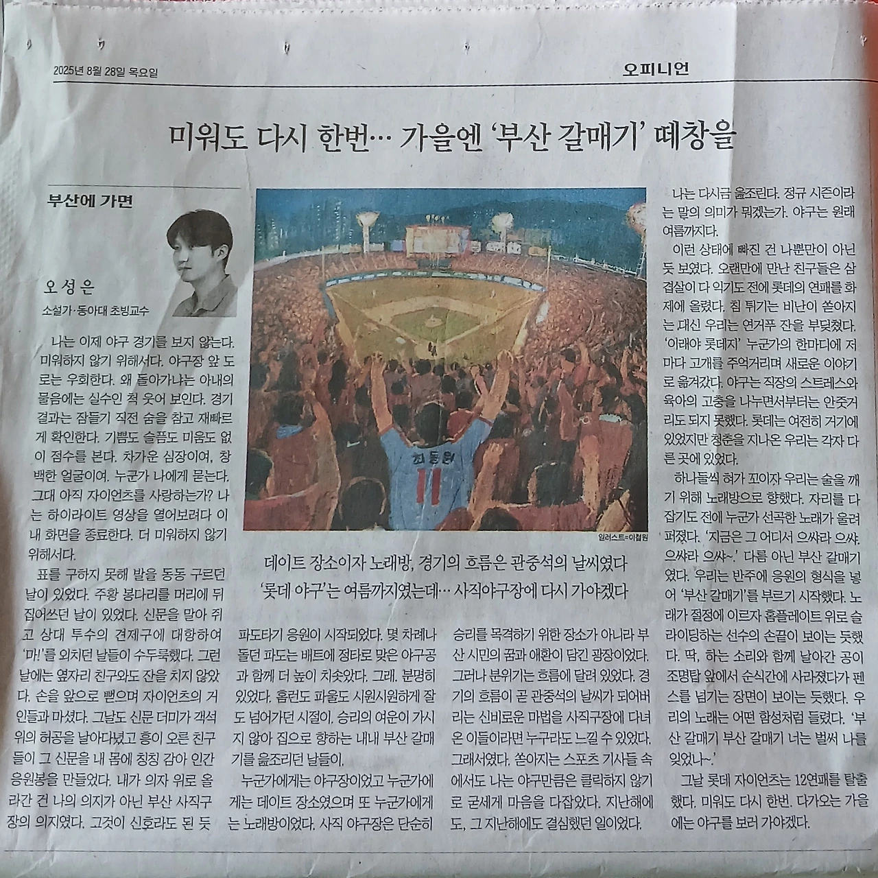 한 때 파란 교복을 입은 학생들은 학교 근처를 지나다 선배들에게 붙들려 짜장면이나 만두를 먹었다지. 학창 시절에 같은 종목을 응원한 경험은 몇 십 년의 나이를 뛰어 넘는다. 야구 명문고에 다닌다고 으쓰대던 조카는 커다란 눈을 껌벅이며 만두를 먹고 온 날이면 무용담처럼 선배들의 넘치는 사랑을 자랑했었다. 2025년 고교 야구는 경남고등학교가 우승했다지. 그래, 올 가을에는 고교 야구처럼 부산 곳곳에서
