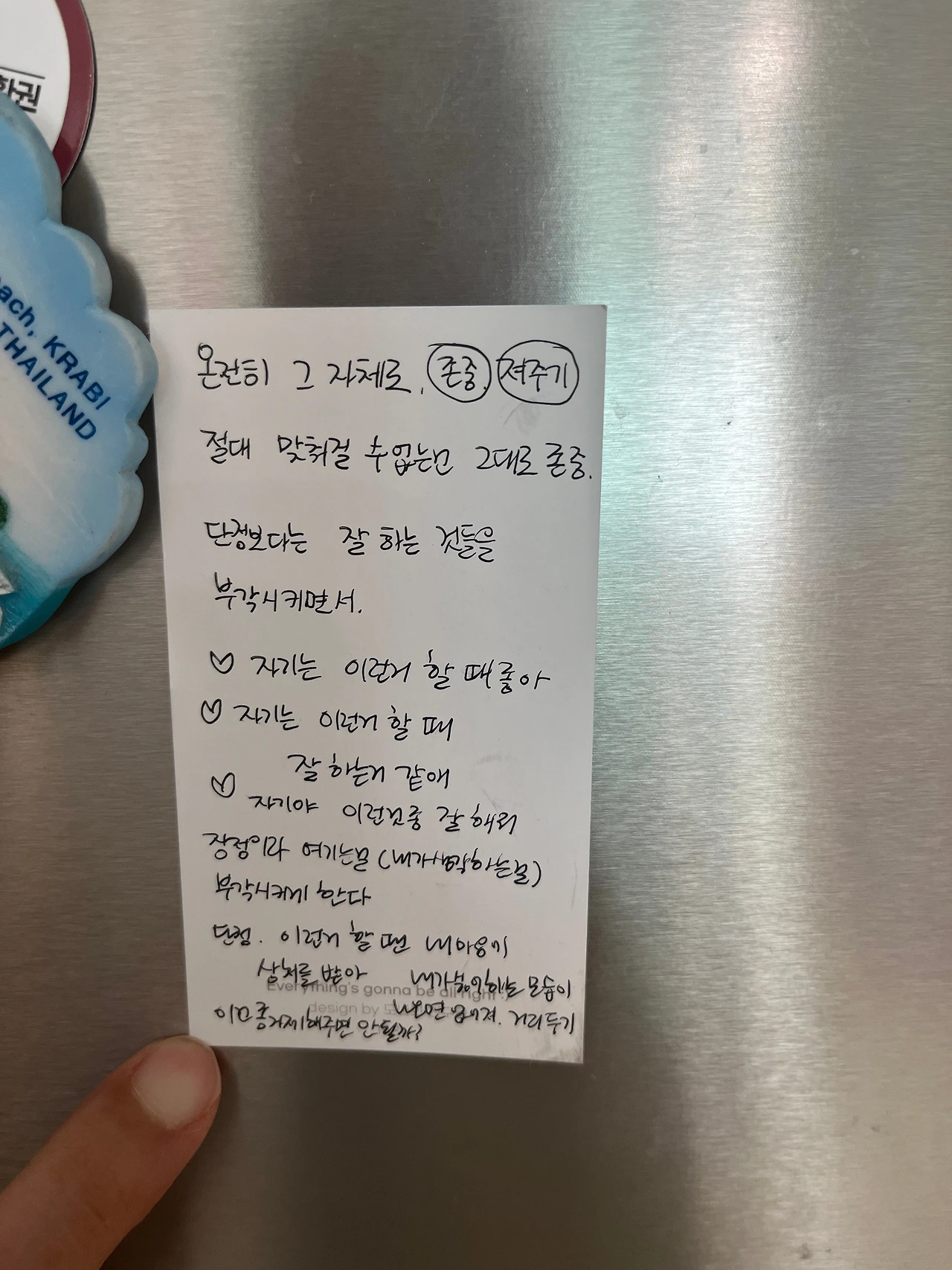 우리는 가족이다. 나는 나를 사랑한다. 가족을 사랑한다. 우리가 평화로우려면 이건 문제도 아니다 라며 되뇌여야 한다. 잠시 떨어져서 생각해 본다. 냉정함을 되찾아 아무일도 아닌걸로 넘겨야 한다.