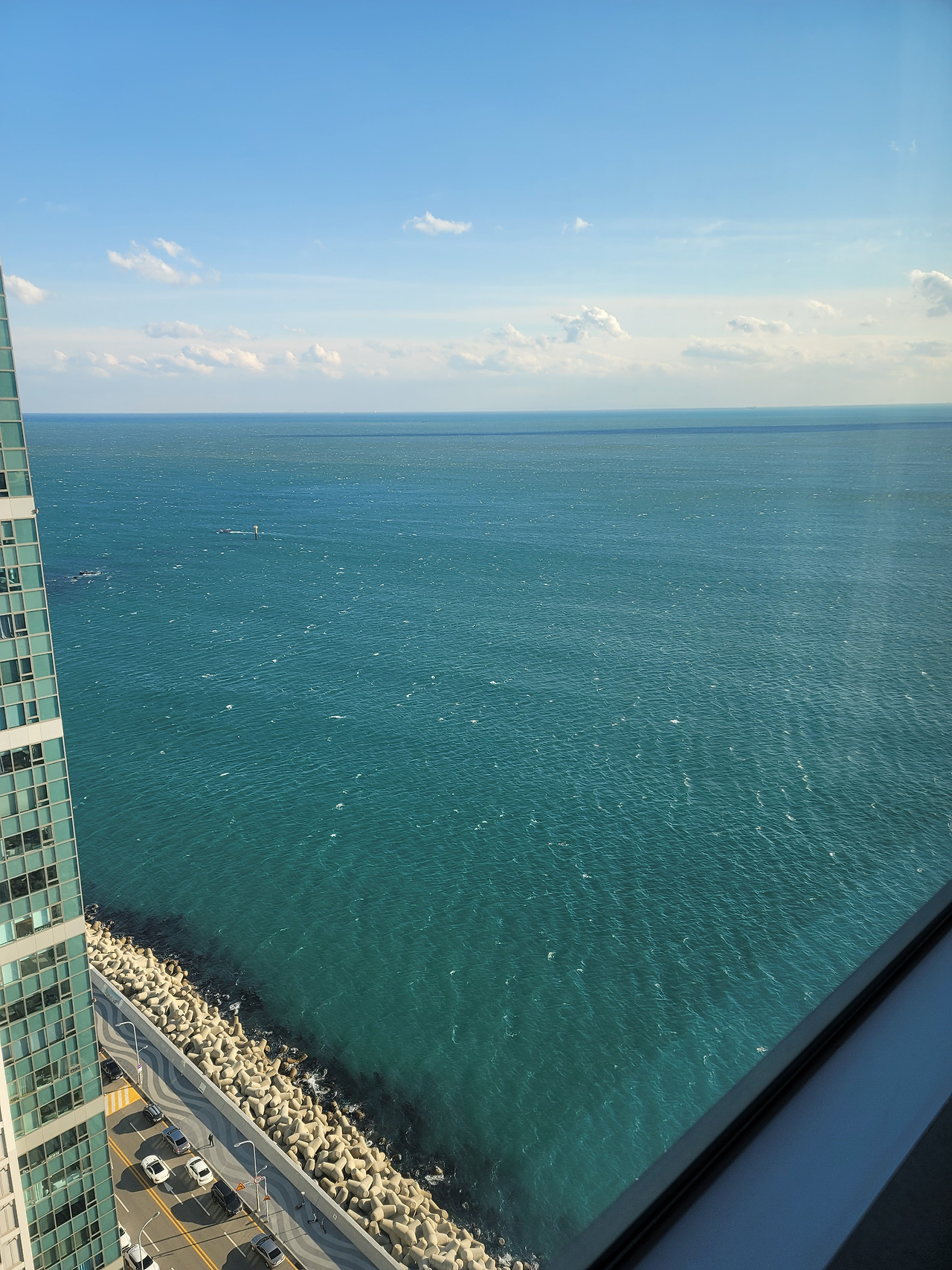연말 부산 출장이 잡혔다. 1박 2일간 분야별로 진행되는 꽤 규모 있는 회의다. 우리 부서 업무별 담당자 셋은 롱패딩에 두꺼운 옷을 겹겹 입고 굴러갈 듯 부산행 비행기에 올랐다. 시간이 빠듯한 탓에 점심도 건너뛴 채 부산공항에서 해운대로 향했다. 도착 후 짐을 두러 객실로 갔다. 창가 커튼을 젖힌 순간 위에서 내려다본 해운대는 차가운 촉감을 두꺼운 유리창 사이에 감춘 채, 화창한 봄의 자태를 연출했다. 온통 파란 하늘과 바다, 찐한 하얀색 구름이 ’내가 구름이야‘ 라고 말하고 있었다. 서둘러 회의장으로 내려와 준비된 커피와 쿠키로 피로를 달랠 때쯤 회의가 시작됐다. 강연 발표를 듣고 있을 때 문자가 날아왔다. ‘12/23일 부산출발 KE1541편이 기상악화로 결항 되었습니다.’ 내일 제주로 돌아갈 항공편이었다.