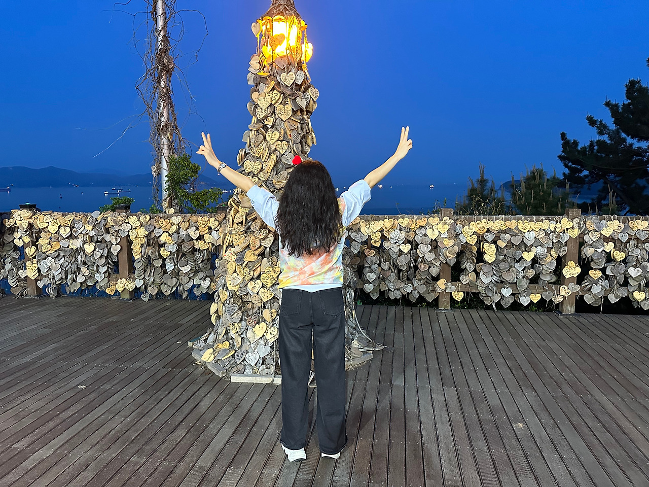 우리는 관광지에 파는 빨강 하트 머리핀을 하나씩 꽂고 해 질 녘 해상 케이블카에 탑승했다. 우리가 차량으로 건넜던 돌산대교를 내려다보며 반대편으로 이동했고, 이미 해가 진 그곳은 따스한 조명이 반짝이며, 걸어가는 곳마다 사진에 나올만한 풍경을 연출했다. 낮 동안의 무더움은 물러가고 기분 좋게 시원한 바람이 살짝씩 스쳤다. 돌아오는 케이블카에서 바라본 돌산대교는 조명에 더 웅장하게 보였고, 여수 밤바다는 그런 돌산대교를 지그시 바라보는 듯 평온해 보였다.