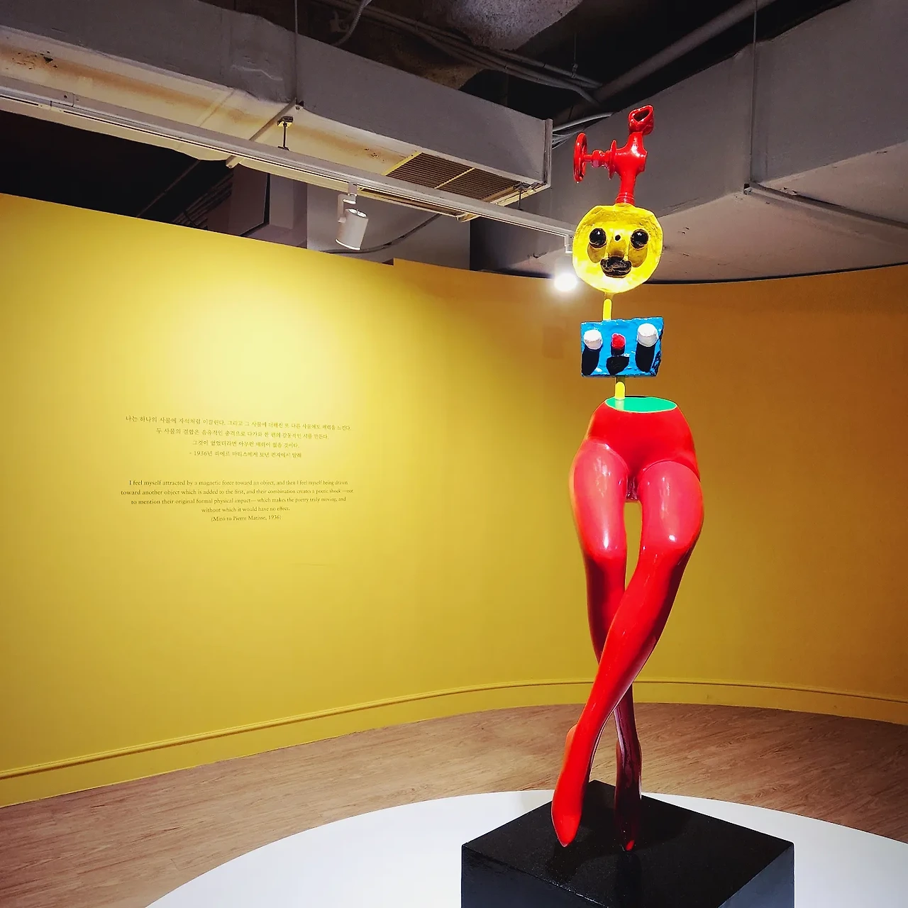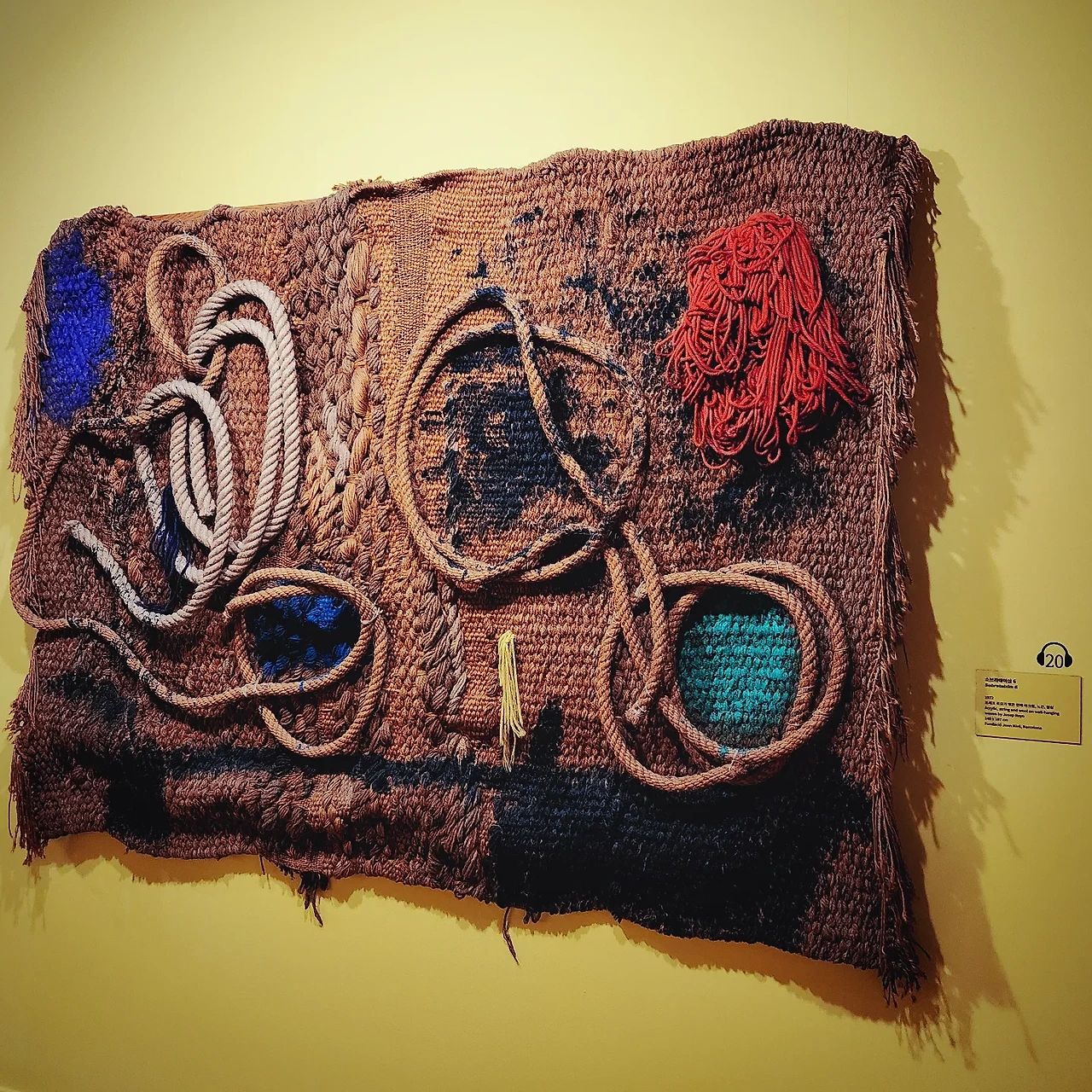 전통적인 회화를 벗어난 호안 미로의 다양한 시도는 주로 세 번째 섹션에서 감상할 수 있었다. 산책 중 주워 온 사물들을 조합하여 만든 오브제와 천과 노끈 등을 활용해서 만든 태피스트리, 시장에서 사 온 다른 화가의 작품에 본인의 상징을 덧대어 그린 그림 등이 있었다. 작품 의도가 이해되지 않아 제목과 작품 형태를 비교해서 나름 '제목스럽게 보이는군' 이렇게 납득하고 빠르게 넘어갔다. 나중에 도슨트 해설을 듣고 머리를 탁 쳤지만. 미로는 회화의 한계를 극복하고자 일정 기간 동안 색다른 재료를 활용하는 것에 매진했는데, 이때 재료가 된 사물들은 본 기능을 잃고 작품의 일부가 되어 새로운 의미가 부여된다는 점이 포인트였던 것이다. 확실히 이러한 오브제는 거칠거나 매끄러운 질감과 강조된 색감 등으로, 2차원적인 그림과 달리 3차원의 공간에서 부피/무게/온도 등을 느낄 수 있다는 점을 깨달을 수 있었다. 슬며시 다음에는 현대 설치 미술에도 도전해볼 수 있겠는걸? 하는 생각이 들었다.