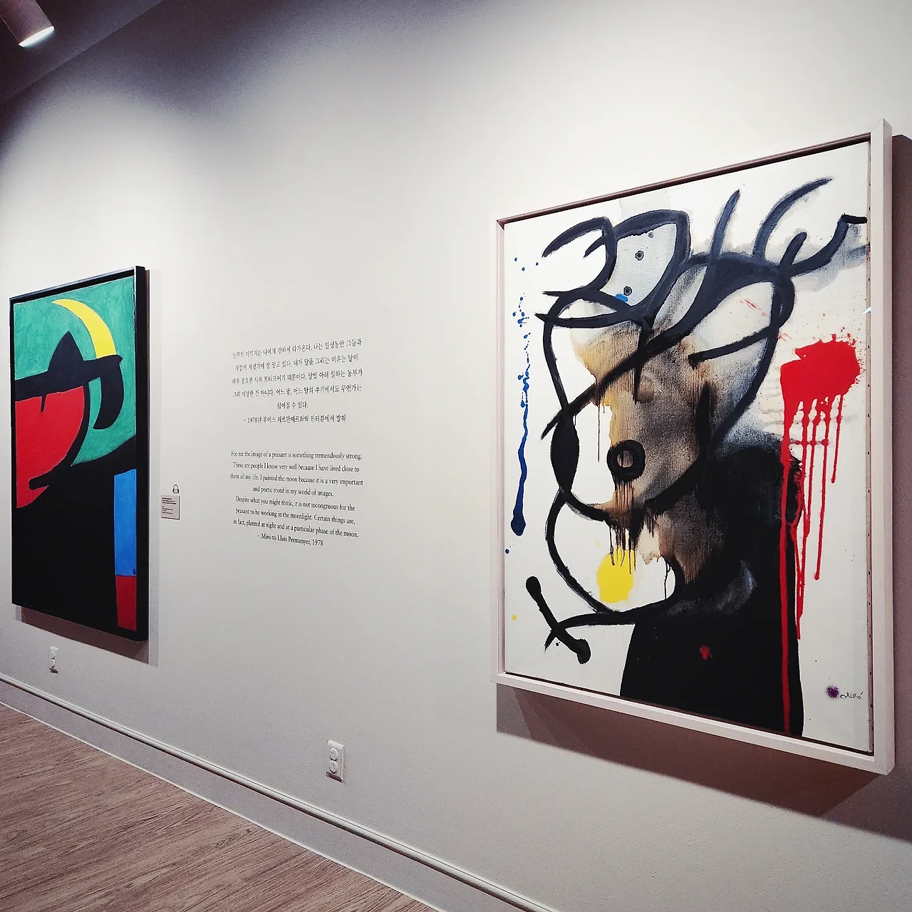 개인적으로 어떤 인물에 대한 서사는 별로 좋아하지 않는 편인데, 확실히 작품을 감상할 때는 그 일면이 작품을 깊이 이해하는데 도움을 주는 것 같다. 네 번째 섹션부터는 도슨트와 발맞추어 작품을 감상했는데, 전달력과 해석에 제작 배경까지 덧입혀지니 혼자 한 바퀴 돌았을 때보다 훨씬 더 많은 것을 볼 수 있고 느낄 수 있었다. 마지막 섹션에서라도 해설을 들을 수 있어서 다행이라는 안도감이 들었을 정도였다. '회화의 암살'이라는 단어와 4개 연작으로 배치된 몬로이치 그림의 해석은 도슨트가 아니었다면 이번 전시에서 접하지 못했을 것이다. 우리의 일상에서, 삶을 살아가며 호안 미로를 찾아볼 수 있을 것이라는 암시도.