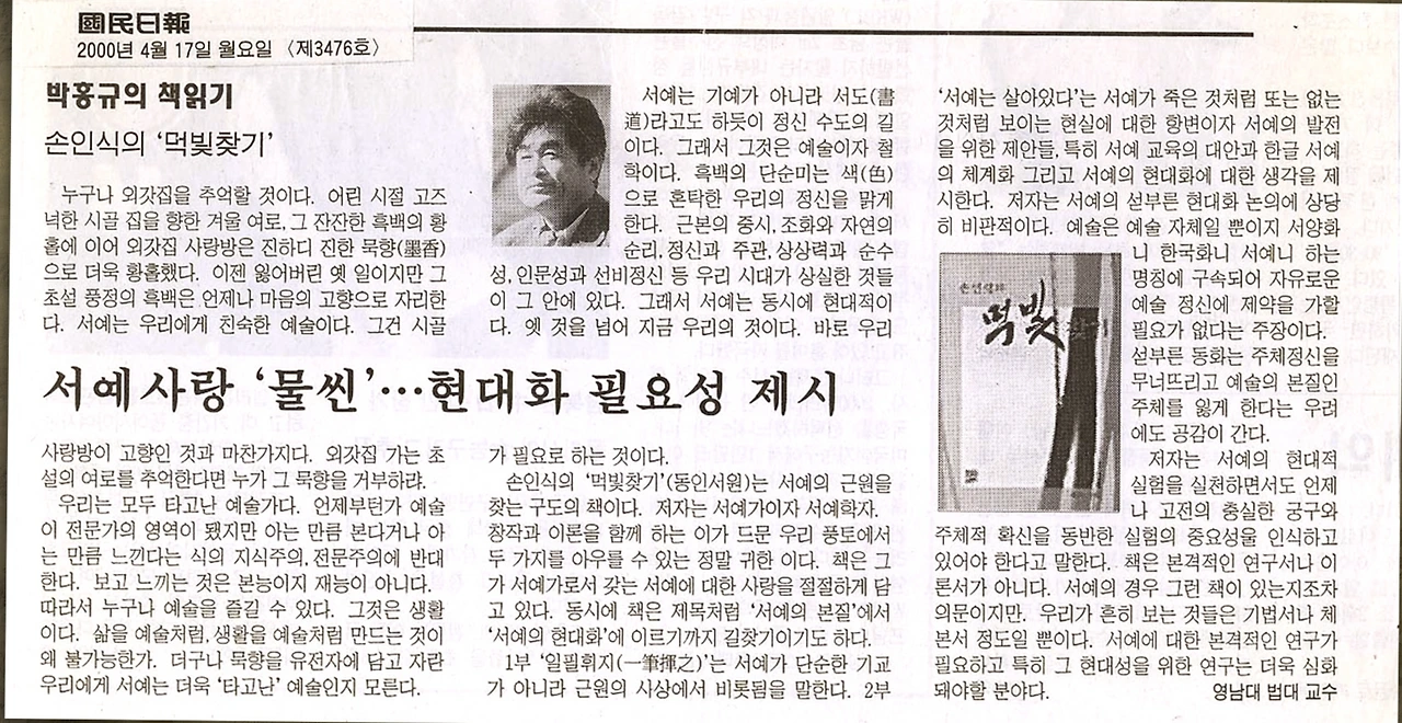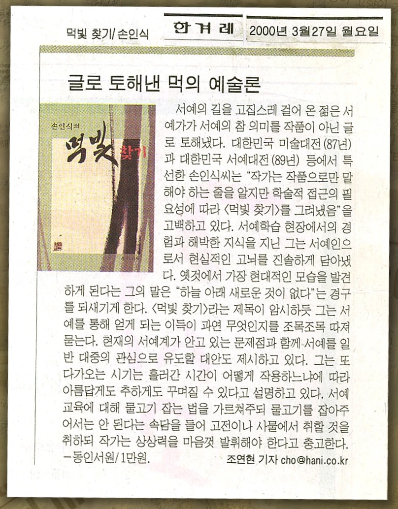 『먹빛 찾기』는 1990년대 10여 년에 걸친 내 글 모음이다. 몇몇 서예 월간지에 연재한 글, 대학의 강의와 공개강좌 자료, 서예학술세미나에 참여한 소논문, 일본서단 견문기, 성균관대학교 유학대학원 동양문화 고급과정 수료 시 제출한 논문, 그리고 문인화의 현대적 패러다임에 관해 기술한 몇 편의 글 등을 수록한 인재 손인식의 4번째 책이다. 당시 만해도 풀어쓴 서예 이론이 드물었던 때문일까? 비교적 환대였다.
