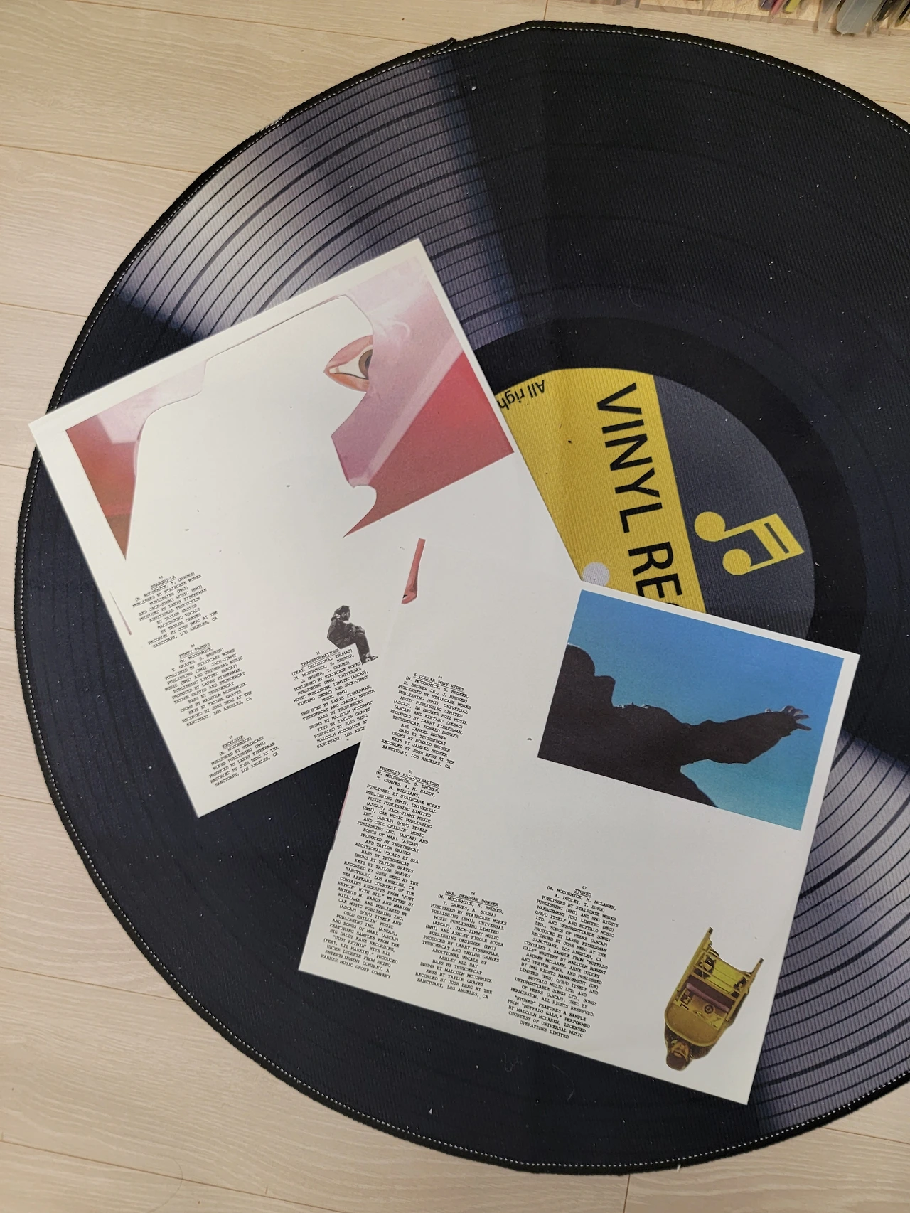 2장으로 되어있는 LP속 표지도 마치 중력을 거부하듯 파편화된 사진들이 콜라주가 되어 흩어져있다. 콜라주는 음악에서도 마찬가지다. 여러가지 비트와 소리, 소음이 특유의 몽환적인 분위기로 조합 되어 있다. 오늘의 나의 픽은 C면 세 번째 곡인 'FUNNY PAPER'! (글을 쓰고 나중에 이 곡이 타이틀 곡이라는 것을 알게됐다..)