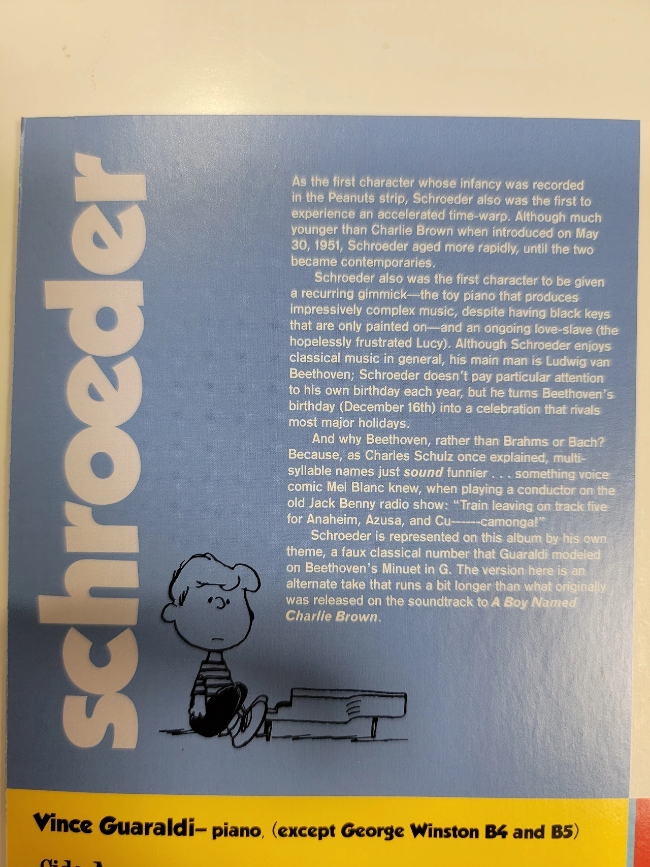이런 캐릭터가 중간에 떡하니 그려져있다는 이유만으로도 스누피ost LP는 살만한 이유가 된다. 그리고 빈스과랄디가 연주하는 업라이트 빈티지 피아노 소리는 왠지 LP로 들어야 더 어울릴 것 같았다.