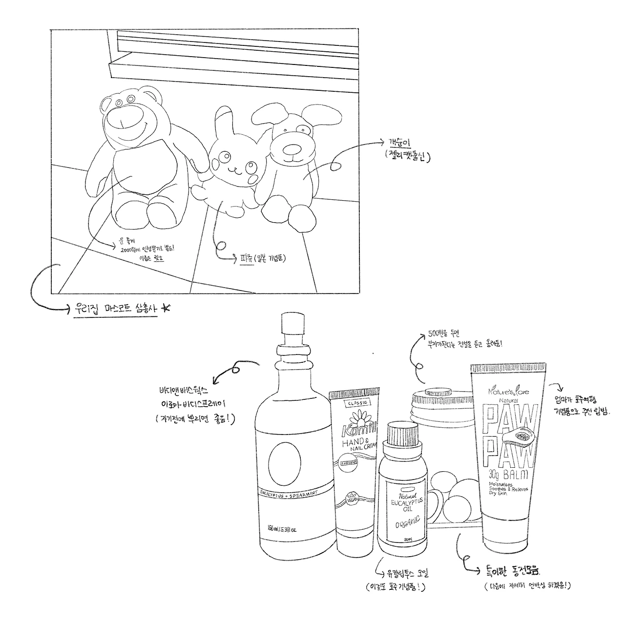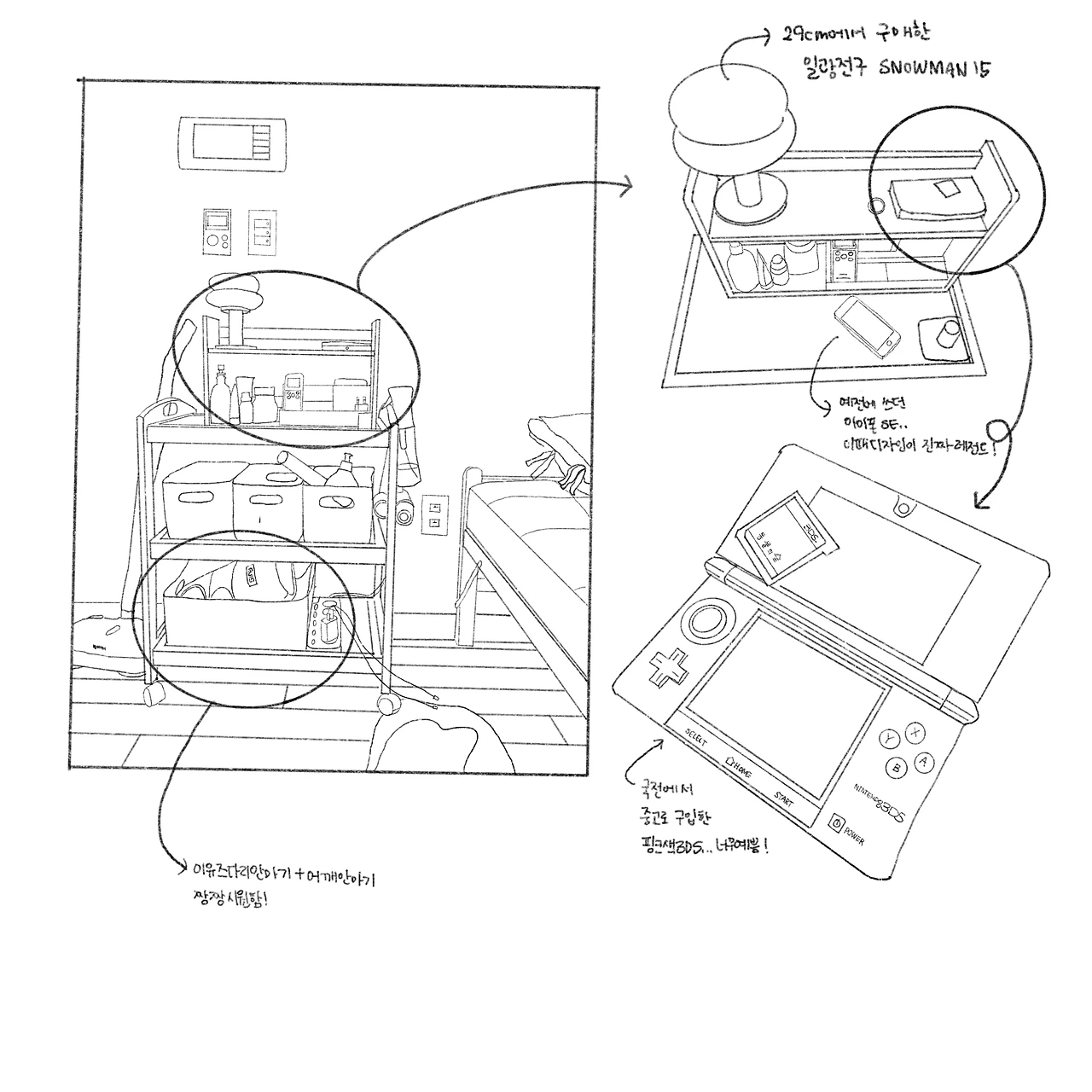 빨래망, 물티슈, 안마기계, 수면등, 유칼립투스오일, 립밤, 닌텐도 3ds 등등 나의 애착템들로 가득한 공간이다.