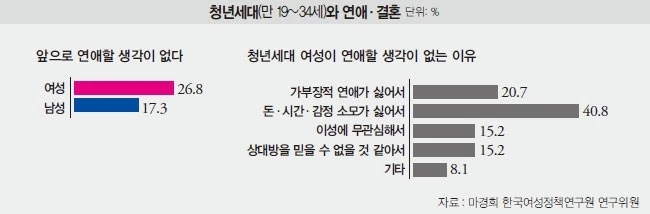 가장 큰 이유는 혼자가 편하기 때문이다. 한국여성정책연구원 주관 보고서 <청년 관점의 '젠더 갈등' 진단과 포용 국가를 위한 정책적 대응 방안 연구>에 따르면, 연애하지 않는 이유로 '돈ㆍ시간ㆍ감정적 소모가 커서'가 45.6%로 1위를 차지했다. 실제로 연애하면 순수한 사랑만으로는 해결되지 않는 경제적, 심리적 비용을 부담하게 된다. 어느 순간부터 그런 것들을 재고 따지는 것이 피곤해지고, 내 삶의 패턴을 타인에게 맞추는 과정이 귀찮게만 느껴진다. 연애의 이상과 현실의 괴리감을 체감한 후, 연애보다 비연애의 효용을 크게 느끼게 되는 셈이다.