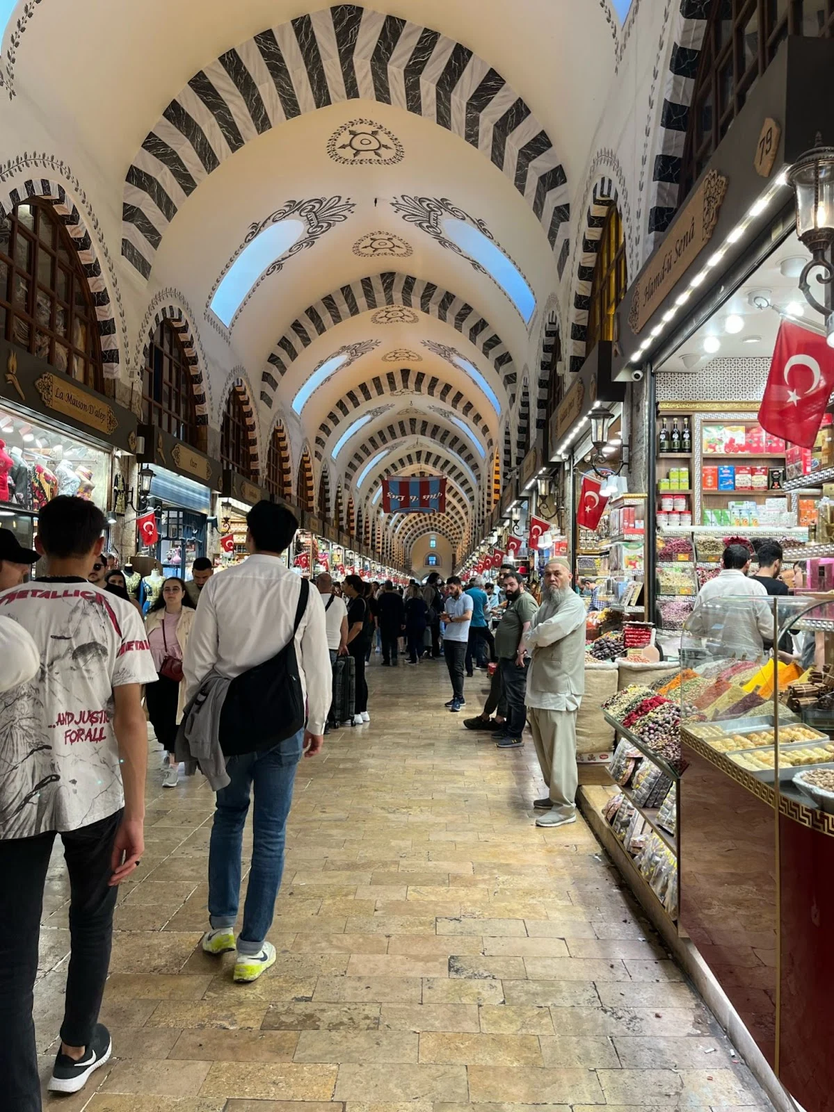 식사를 마치자 자연스럽게 갈라타 다리를 향해서 걸었는데, 가는 길이 바로 그랜드 바자였다. 줄지어서 끝없이 옷과 잡화를 파는 가게가 이어진다. 글씨를 전부 한글로 바꾸고 인종적 차이만 무시하면 남대문이었다. 아니 그냥 자세히 보지 않으면 남대문이었다. 사람의 흐름을 따라서 천천히 갈라타 다리로 향해 가는데 실내 상점이 보였다. 가방까지 검사하고 들어가는데 여기가 스파이스 마켓이라고 한다. 터키 과자와 기념품 등이 줄지어 있지만 흥정에 약한 우리는 물건을 구매할 생각은 딱히 하지 못하고 구경만 많이 했다.