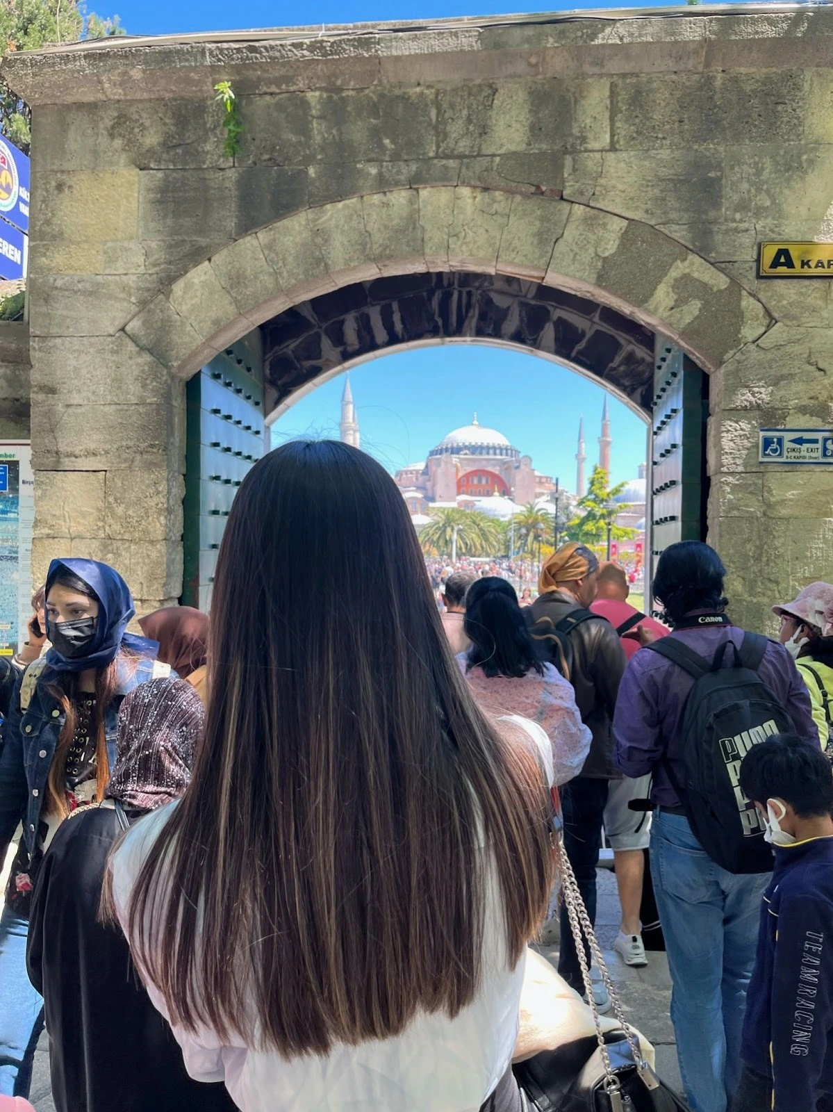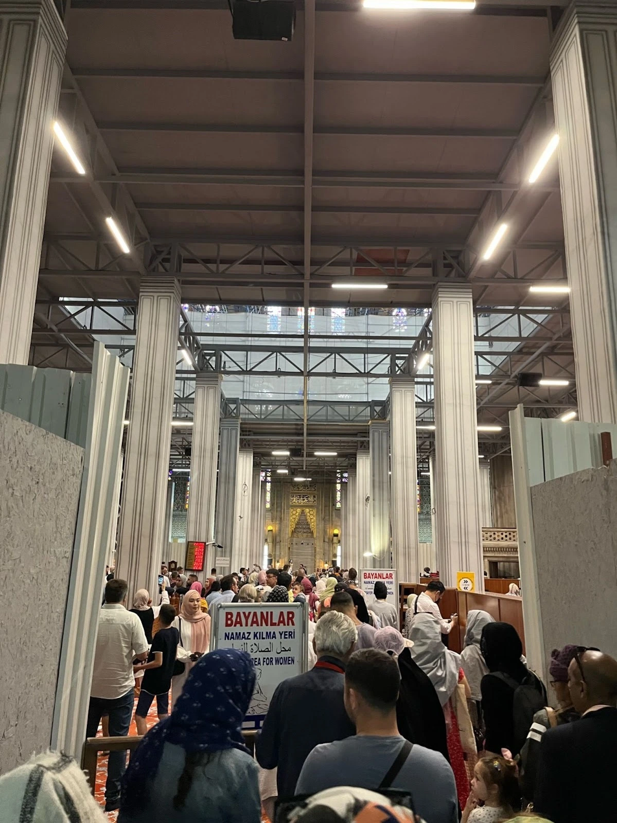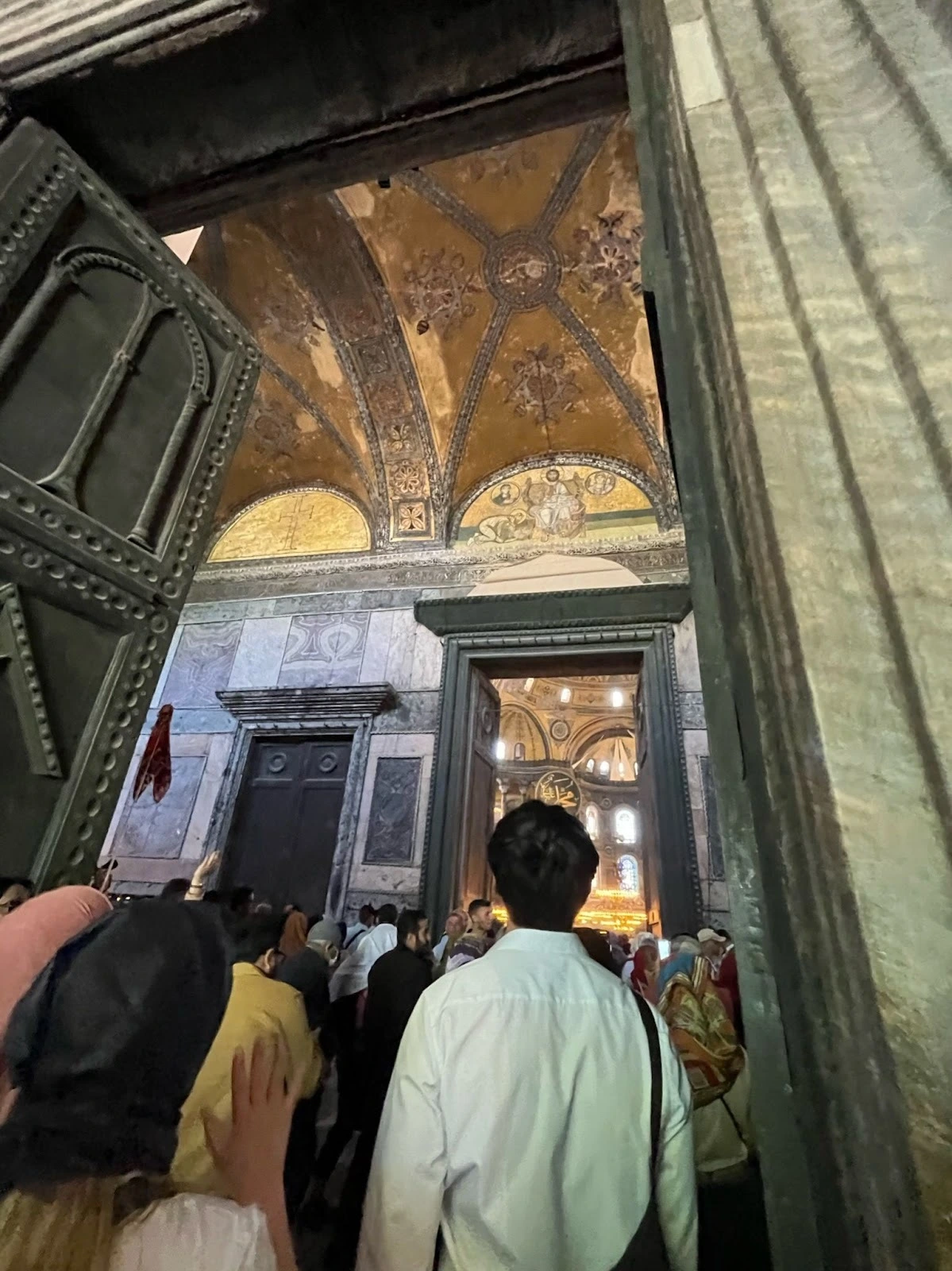 자연스럽게 입구까지 도착했지만 역시나 사람이 꽤 많다. 한참을 기다린 끝에 입장했다. 들어가는 순간까지도 왜 특별한지 이해가 안 되는 기분이었지만 입구로 들어서자마자 생각을 고쳐먹을 수밖에 없었다. 본당 입구와 바깥문 사이의 일종의 회랑의 돌이 품질이 대단하다. 여러 가지 무늬석을 맞춰놓고 그 위를 화려한 금빛 모자이크 타일로 장식해놓았다. 입이 쩍 벌어졌다. 알고 보니 지진이나 설계 실수로 인한 보수 공사를 많이 했고, 그때 주로 고강도 벽돌을 사용해서 마무리했다고 한다. 즉 덕지덕지 쌓여있는 듯한 벽돌은 수리를 위해서 말 그대로 나중에 임기응변으로 쌓아 올린 벽돌들이 섞여 있었던 것이다. 기구한 운명의 상징이랄까? 들어갈 때 신발을 벗어야 했는데 블루 모스크처럼 들고 다니는 것이 귀찮을 것 같아서 구석에 있는 신발장에 넣었다. 그렇게 비싼 신발도 아니고, 그래도 종교 시설인데, 훔쳐가진 않겠지라는 생각이었다.