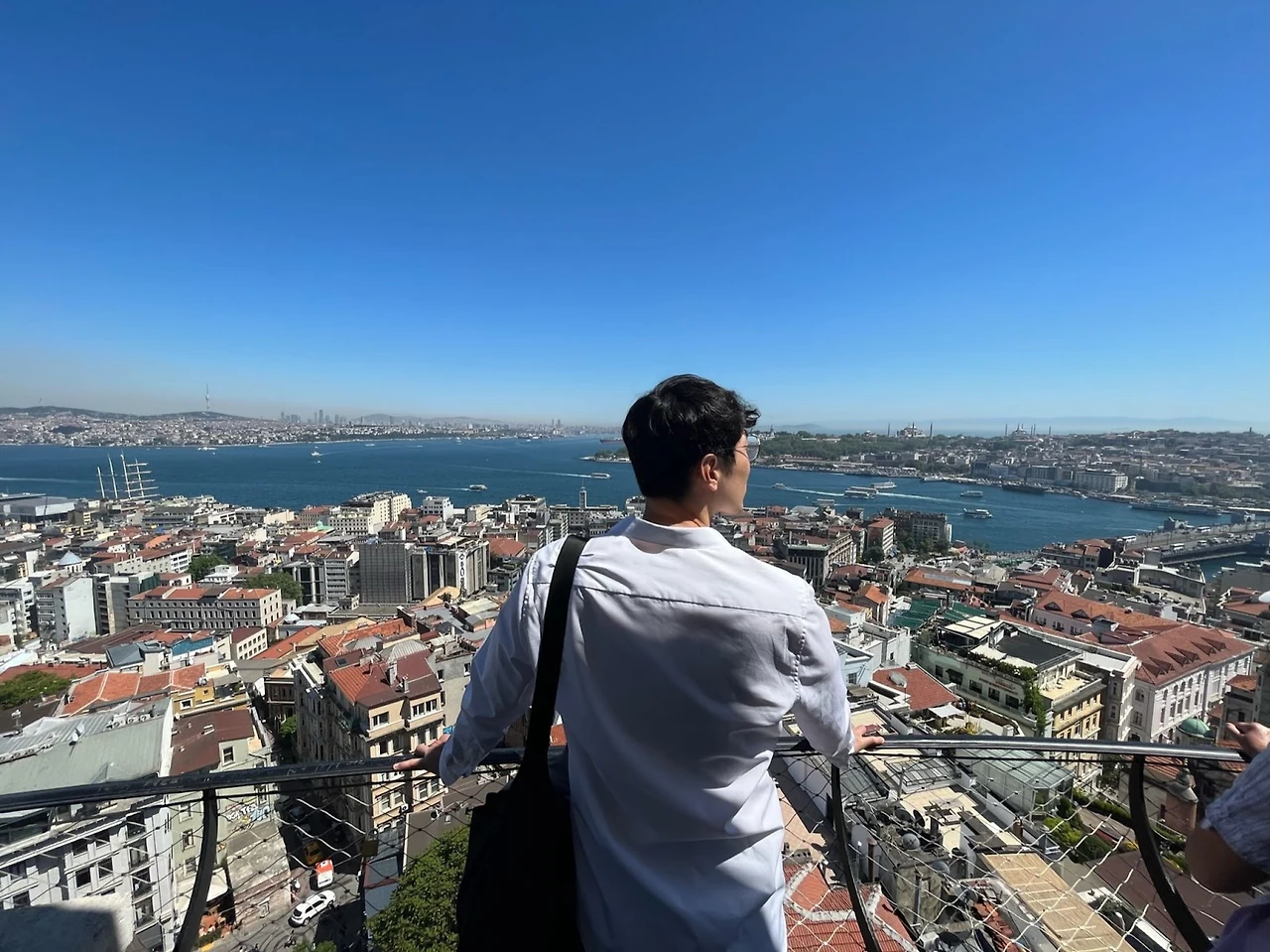 향료 시장을 나서자 바로 앞 골든혼을 건너는 갈라타 다리가 보인다. 이미 꽤 걸어서 다리를 아끼는 차원에서 한정거장이지만 트램을 타고 이동했다. 트램 역에 내리자 길을 찾을 것도 없이 사람들을 따라가니 갈라타 타워로 올라가는 길이다. 기온도 별로 높지 않고 바람도 많이 불지만 역시 햇볕과 언덕에 땀이 흐른다. 올라가는 언덕 주변에는 낙원상가 같이 악기나 앰프를 파는 가게가 많이 보인다. 갈라타 타워 앞에 줄이 길게 늘어서 있어서 입장에 시간이 오래 걸리나 걱정했다. 그런데 다행히도 티켓을 구매하는 줄이다 뮤지엄 패스 덕에 바로 입장 줄로 가니 얼마 기다리지 않고 타워로 올라갈 수 있었다. 타워에서 바라보는 풍경이 볼만 했다. 청명한 하늘에 공기도 맑아서 멀리까지 잘 보였다. 보스포러스 해협 건너편의 아시아지구와 금각만 건너편의 역사지구를 골고루 살펴볼 수 있었다. 타워 테라스를 한 바퀴 돌면서 볼 수 있는 곳이 있었는데 한 아저씨가 DSLR을 들고 사진을 찍다가 우리가 지나가니 사진을 찍어준다고 한다. 전화기를 내밀자 기다렸다는 듯이 멋진 사진을 찍어주신다. 짧은 사이에 포트레이트 모드에 광각까지 번갈아가며 여러 장을 찍어주셨다. 아마 취미 삼아서 관광객에게 인생 샷을 선물해주는 것 같다.