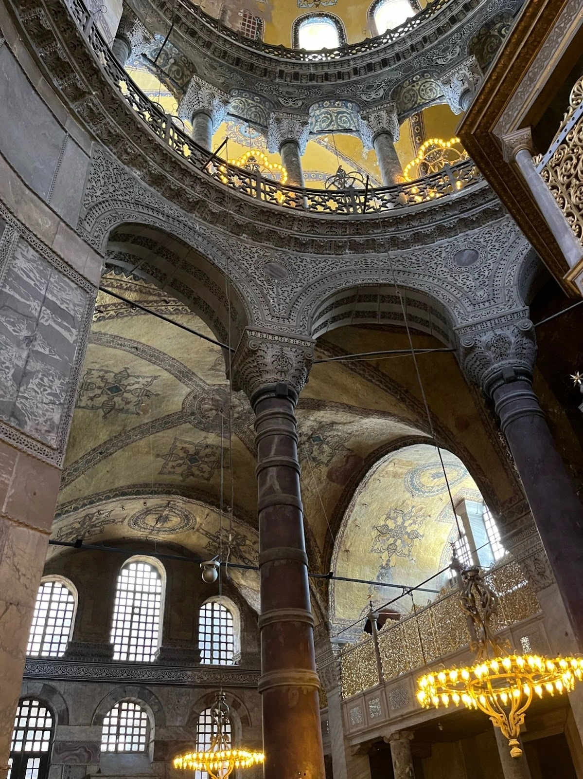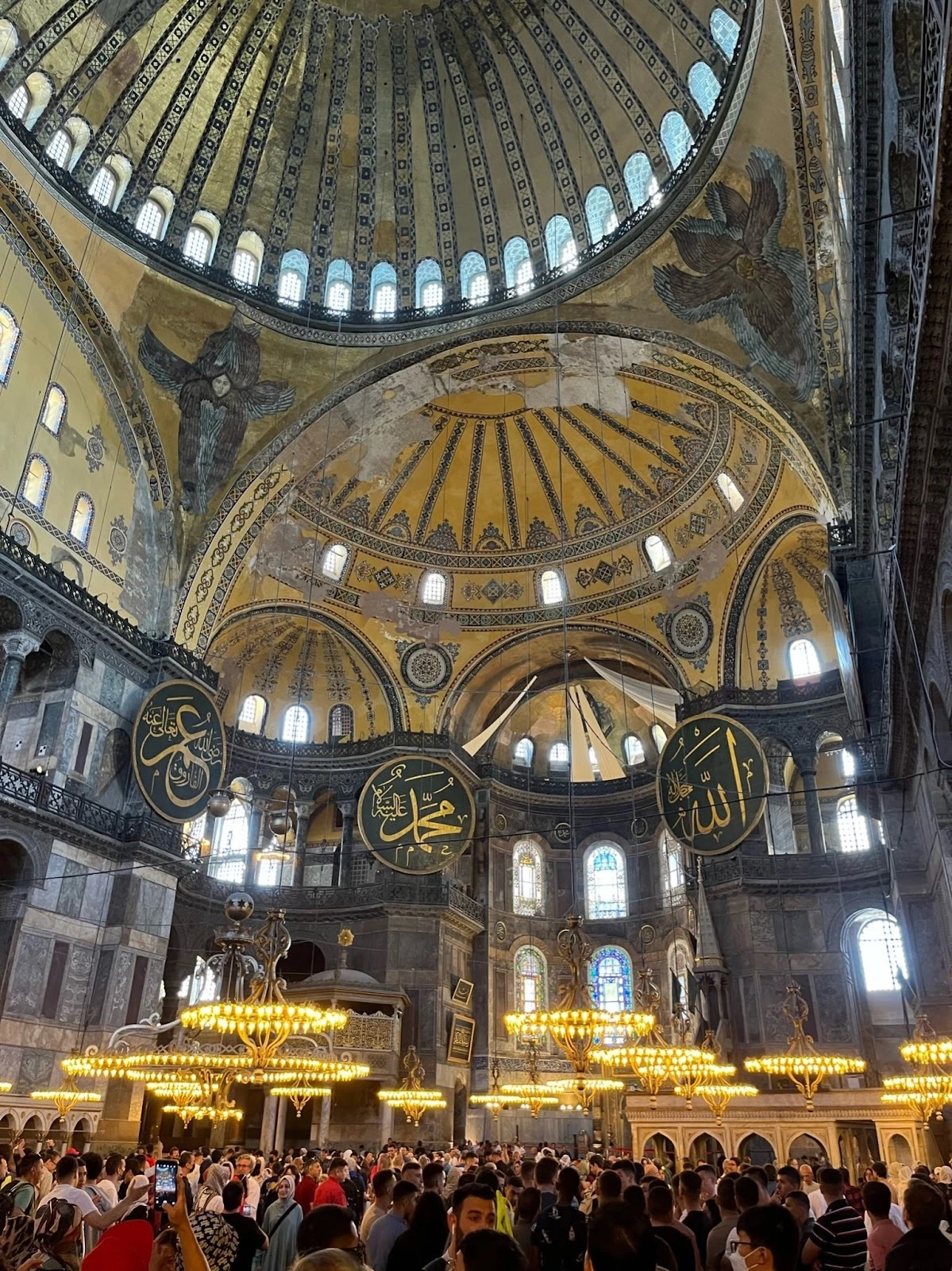 본당에 들어가자 실내 공간이 너무 넓어서 거리 감각이 무뎌진다. 물론 예전에 베드로 대성당에서 느꼈던 감각만큼은 아니었지만 충분히 비슷한 느낌이었다. 화려한 무늬석을 짜 맞춰 쌓아 올린 벽, 천사의 모자이크화, 아마도 예수라서 가려놓은 듯한 천장의 금색 모자이크, 성화 스테인 글라스, 모스크로 개조하면서 달아놓은 듯한 이슬람 서예 작품 판, 거대한 큐폴라, 낮게 깔려서 차분하게 비춰주는 전등까지 탄성이 절로 나온다. 이슬람과 기독교, 유럽과 근동의 문화 요소들이 뒤죽박죽이지만 나름대로 조화롭게 어울려있다. 어쩌면 아야 소피아는 곡절 많은 이스탄불의 역사 그 자체를 나타내고 있는 것 같다.