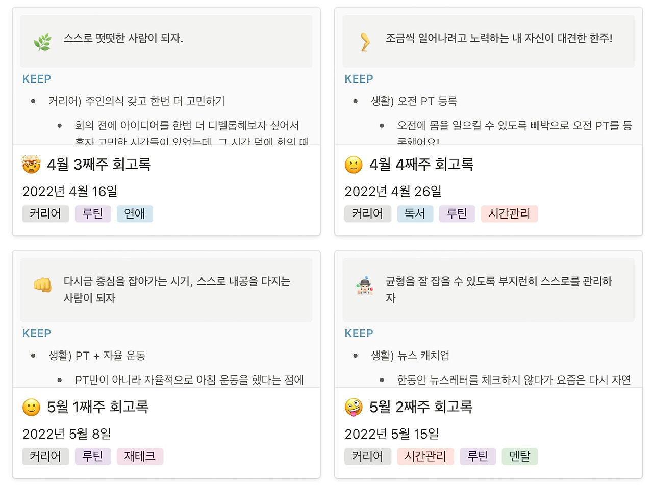 매주 회고를 하다 보면, 의식적으로 내 삶을 개선하기 위한 고민을 시작합니다. 직장인의 삶이란 대개 반복적이고 무료해서 살다 보면 그냥 살게 되는데요, 매주 회고 시간 덕에 그래도 한 번씩 내가 어떻게 살고 있는지 돌아보게 됩니다. 사실, 현재 생활에 문제가 있어도 이걸 어떻게 개선하고 실행으로 옮길지 고민하는 시간을 의식적으로 가지지 않으면 그대로 지속하게 되는 경우가 많죠. 그런 면에서 제게 회고는 매주 제 삶에 경종을 울리는 알람과도 같습니다.