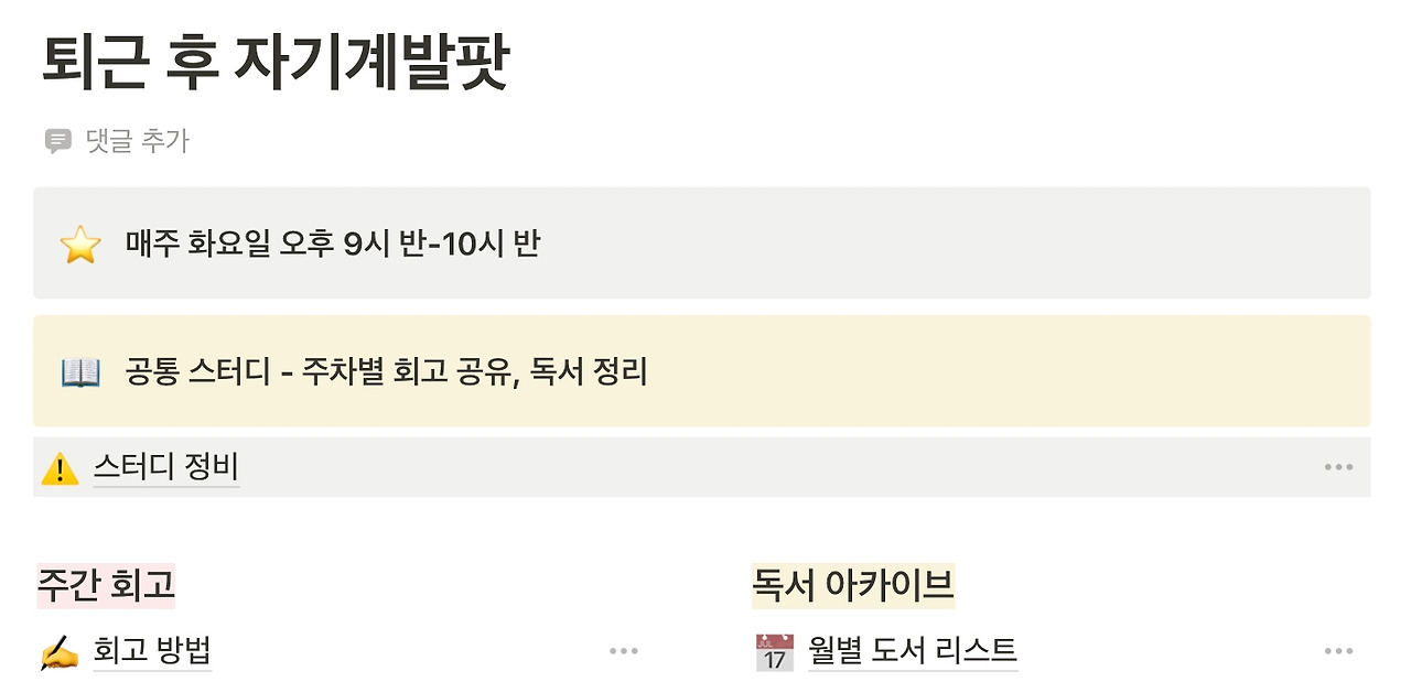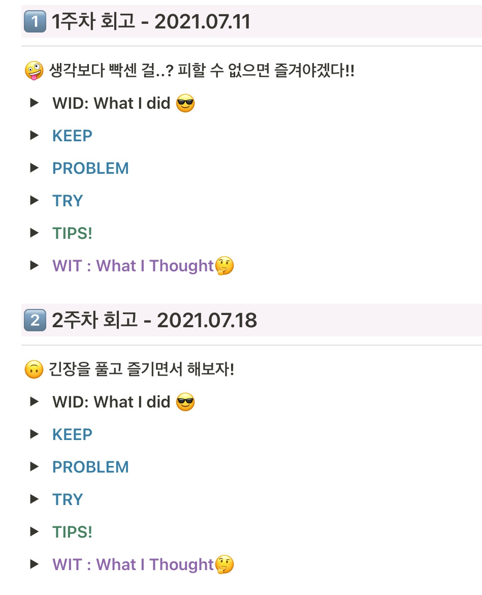 해당 회고 방식에서 가장 중시하는 부분은 1) Problem이 단순히 현상 나열이 아니라 원인에 대한 분석을 포함해야 하고, 2) Try가 명확하게 실행 가능한 액션이어야 한다는 점입니다. 단순히 ‘이번주에 무엇이 문제였는지’가 아니라 ‘왜 그런 문제가 발생 혹은 반복했는지’ 스스로 고민하고, ‘다음 주에는 어떻게 개선할지’ 분명한 액션 아이템을 도출하는 것이죠. 뿐만 아니라 회고의 앞뒤에는 이번주에 한 일과, 생각을 기록하고 스스로 한줄평을 남기기도 합니다! 한주를 정리하는 나름의 방식이랄까요.
