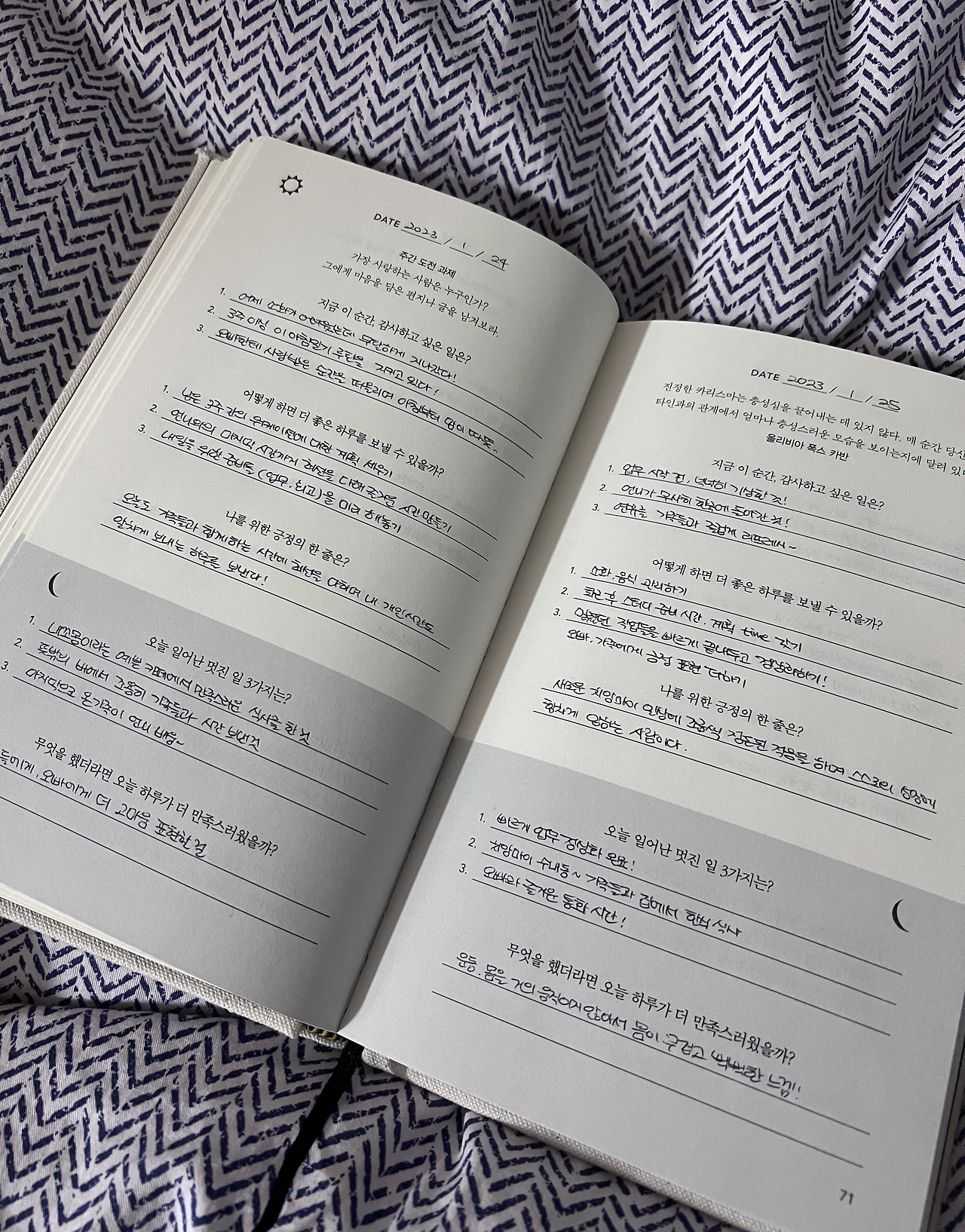 올해부터 제 아침을 새롭게 바꾼 루틴이 있다면 바로 아침 일기인데요, 주로 평일 아침 출근 전에 짤막하게 하루를 준비하는 개인 시간입니다. 저는 ‘하루 5분 아침 일기’라는 책의 형식을 따라 오늘 감사할 일, 노력할 일, 자기 확언을 세줄 정도로 간단하게 기록합니다. 이 일기에는 하루를 마무리하면서 그날의 좋았던 일과 개선할 수 있었던 것도 기록하게 되어 있습니다만, 저는 이 부분도 아침에 함께 씁니다. 어제의 하루를 돌아보고 오늘의 하루를 새롭게 여는 저만의 리추얼이죠.