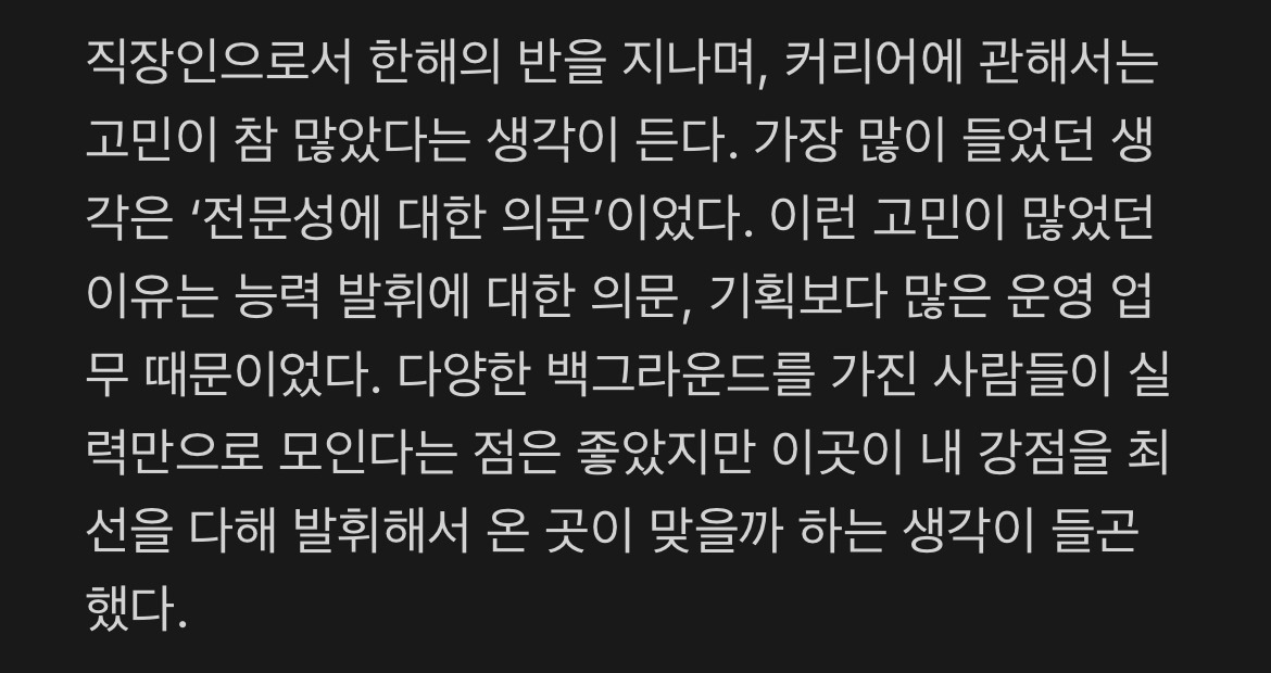 사실 신입 기획자에게 대단한 프로젝트들을 맡길 수 없다는 건 너무 당연하죠. 그런데 저는 창업팀, 스타트업과 같이 비교적 규모가 작은 곳에서 처음으로 업무 경험을 시작했습니다. 이곳에서는 워낙 인원 자체도 적고 시니어도 많지 않았기 때문에 당시 인턴이었던 제가 여러 프로젝트를 주도하는 경우가 꽤 있었습니다. 현재 제가 몸담은 기업과 같이 규모가 큰 기업에는 그런 일이 드물기에 더욱 좌절했는지 모릅니다.