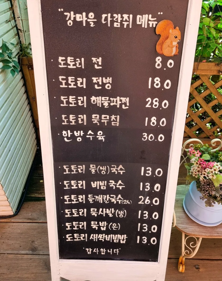 담백하고 깔끔한 맛 외에도 이 집의 특별한 명성은 예쁘게 조성해 놓은 정원과 바로 앞으로 보이는 팔당호반에서 나온다. 안으로 들어서면 각양각색의 꽃과 나무 사이로 호수의 전경이 펼쳐진다. 상수원 보호구역에서 마주하는 예상외의 풍경에 다들 놀랍다는 표정이다. 이 집은 식사시간대에 찾으면 으레 30분 이상은 기다리는 게 당연하다고 받아들인다. 대기 시간이 그 이상으로 늘어나도 불평 한 마디 안 한다. 외려 대기 시간을 즐긴다. 풍경만 봐도 배가 부른 까닭이다. 한겨울엔 바깥 화롯가에 앉아 불 지피면 추위 대신 따사한 온기가 몸과 마음을 데워준다. 강마을 다람쥐는 밍밍한 물빛이 노을빛으로 변해가는 저녁이 좋다. 안개가 피어오를 때도 좋고 비가 내려도 좋은 곳이다.