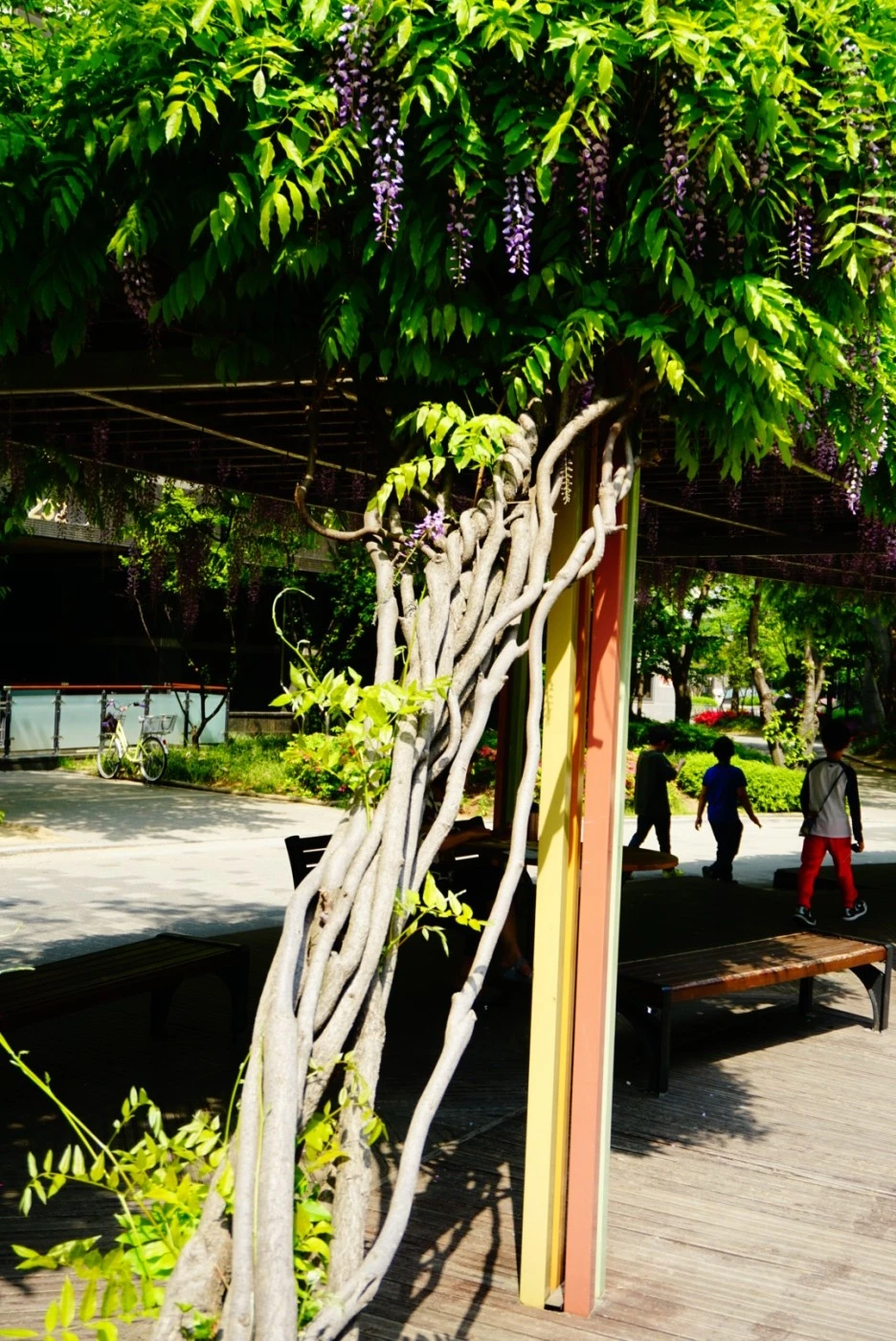 등나무는 화투에도 등장한다. 4월을 지칭하는 '흑싸리'가 등나무다. 아무짝에도 쓸모없는 것을 일컫기도 하지만 더운 날 이만큼 실속 있는 나무도 없다. 예전에는 초여름 무렵 꽃이 피었는데 이제 4,5월이면 꽃이 포도송이처럼 다닥다닥 달린다. 꽃이 지면 무성한 이파리가 발치에 넉넉하고 시원한 그늘을 드리워줌으로써 사람들의 이야기꽃까지 피우게 한다.