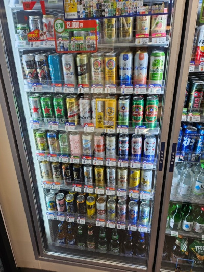 편의점에 다양하게 진열된 맥주와 안주들,