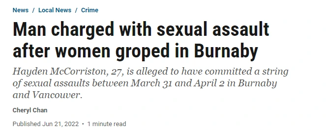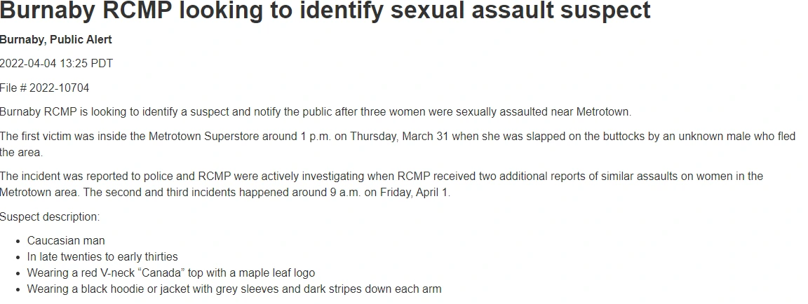 2022년 4월 1일, 만우절 같은 일이 나에게 벌어졌다. 그 당시 필자는 Dollarama (우리나라의 다이소 같은 곳)에서 일을 하고 있었다. 아침 스케줄이라 가게 안에는 그 다지 손님들이 많지 않았다. 물건들을 선반에 진열하기 위해서 종종 사다리를 이용하는데 그날도 변함없이 사다리 위에서 물건을 정리하고 있었다. 마침 매니저가 내가 일하는 aisle에 찾아와 이야기를 하고 있을 때였다. 우리 둘은 대화를 하고 있었고 뒤에서 누가 다가오는지 인지하지 못하고 있었다. 그 순간, "짜아악" 하는 소리가 들렸다. 우리 둘은 1초동안 멍하니 있었다. 그 남자는 사다리 위에 있었던 나에게 다가와 내 엉덩이를 때리고 서서히 출입구 쪽으로 걸어 나갔다. 이게 뭔가 했다. 기분이 나쁘고 자시고 할 틈도 없이 그 남자는 그대로 사라졌다.
