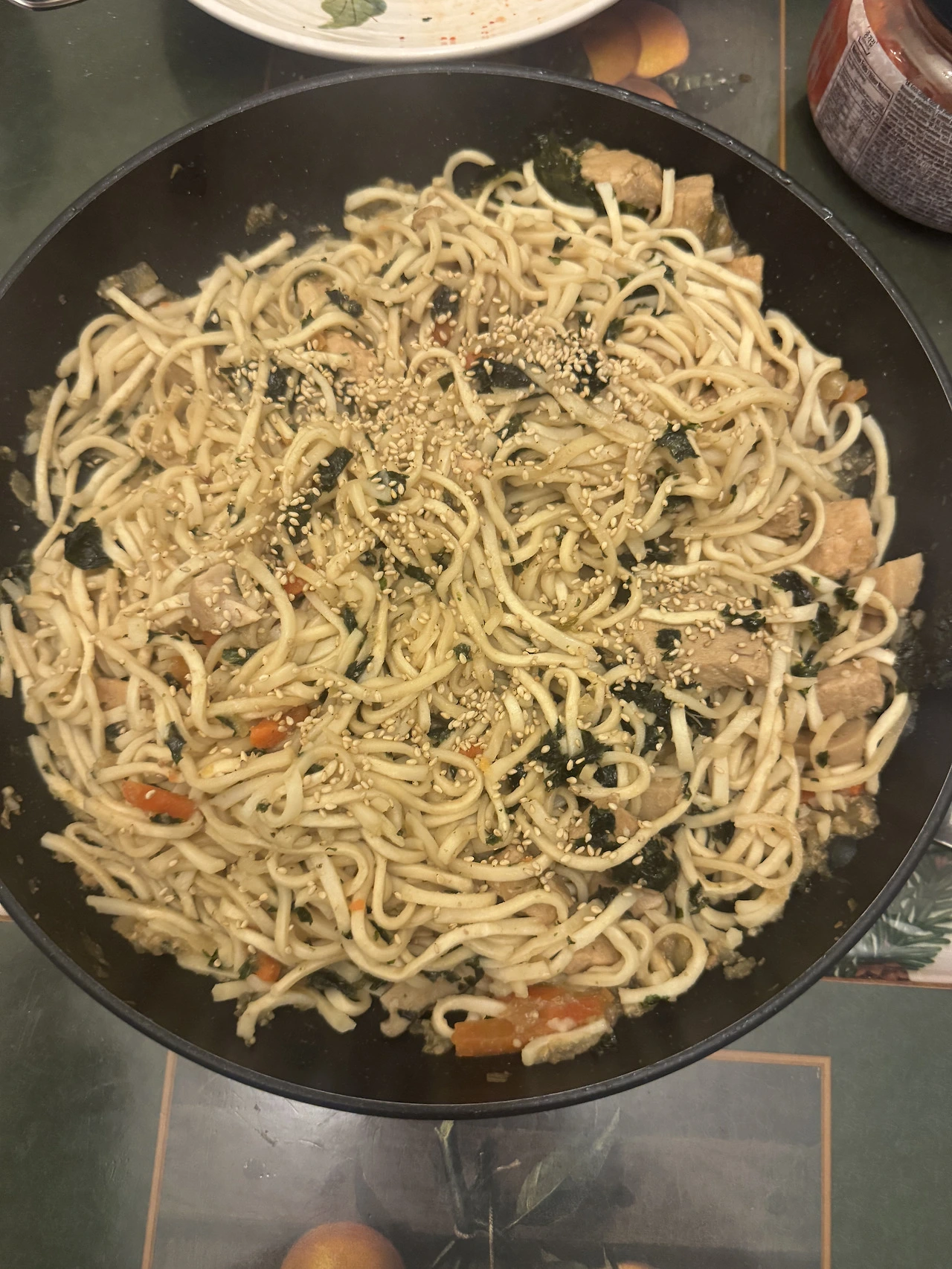 퇴근하자마자 집에 와서 바로 만들었지. 면은 집에 있는 아무 면이나 사용했어. 삶아서 준비해 두고, 삼겹살을 볶다가 그 면을 넣고 같이 볶아줘. 삼겹살 기름에 간이 배면 거기에 쯔유랑 간단한 양념을 더해서 볶아주고 마지막에 김가루까지 뿌리면 끝. 결과는 대성공—진짜 맛있었어.