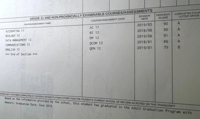 캐나다에 머무는 동안 천천히 레벨업이나 해야겠다고 생각했었지만 고등학교 졸업장의 파워를 알게 된 후에 박차를 가해 레벨업에 힘썼다. 2-6월/ 7-8월/ 9-1월 분기로 수업을 들을 수 있고 분기마다 새로운 레벨을 받을 수 있다. 필자는 2-6월에 레벨5를 거쳐 7-8월에 레벨7을 받고 9-1월에 Communication12를 받았다. 모든 레벨을 교사의 제량으로 매겨질 수 있는데 본인이 원하면 그대로 가는 것이고 상향이나 하향해서 받을 수 있다. 필자는 여름학기가 끝날 때쯤 교사가 Eng 9을 가거나 Com12를 추천해 주었는데 필자의 목표는 고등학교 졸업장이었음으로 빠른 레벨업이 필요했다. Com12 부터가 학점을 딸 수 있기에 조금 무리를 해서 레벨업을 했었고 만약 못따라가겠음 언제든지 다운그레이해도 되기에 밀고 붙쳤다. 확실히 일반레벨의 영어수업보다 에세이를 쓰는 훈련을 많이 했던 것 같다. 그 당시에 일과 병행을 하면서 공부를 했어야 했기에 에세이 숙제가 있는 날이면 밤을 새야할 정도로 정말 바빴던 기억이 난다. 학창시절에 배웠던 영어가 쓸모 없을 정도로 완전히 새로운 영역의 영어를 배우고 있었다. 그 이후로 Eng12, Account 11, Biology 12 그리고 Data management 12까지 이수하였고 마침내 고등하교 Diploma를 취득할 수 있게 되었다.