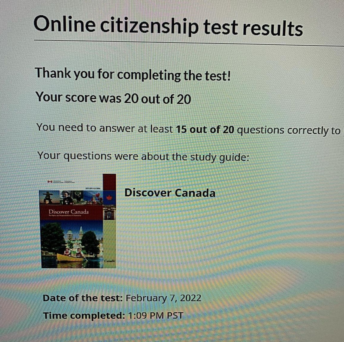 시민권 신청은 영주권만큼 그리 까다롭지는 않다. 다만 영어점수가 필요하고 시민권 시험을 치러야 한다. 다행히 나에게는 이미 High School Deploma가 있었기에 영어점수는 필요하지 않았다. 시민권 시험만 준비하면 됐다. 시험은 캐나다에 대한 기본 역사와 전통에 대한 시험인데 시험용 책자를 제공해 주기 때문에 그것만 열심히 공부하면 시험은 그리 어렵지 않다. 하지만 만만하지 않기에 공부는 꼭 해야 한다. 총 20문제 중에 15개까지가 커트라인인데 다행히 나는 20문제 전부 맞춰서 안전하게 시험에 통과했다.