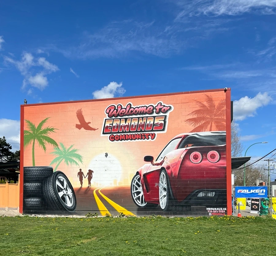 내가 사는 동네는 Burnaby에 있는 Edmonds라는 곳인데 이 동네에는 mural들이 꽤 있다. 초등학교 건물에도 이런 벽화들이 많이 그려져 있다. 위에 있는 건물은 아마 tire shop 일거다. 이 거리는 매년 클래식 자동차 모임을 하는데 나름 지역 행사처럼 여겨지는 것 같다.