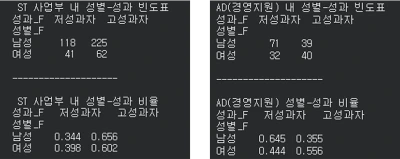 그런데 경영지원 부서 안에서 남녀 각각의 고성과·저성과 비율을 따로 보면, 앞에서 전체 조직 단위로 봤던 패턴과는 다른 모습이 나타난다.