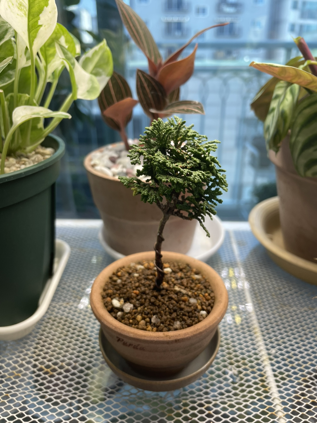 저면관수를 해주면 물을 꿀떡꿀떡 잘 마시는 데 비해 자라기는 자라나 의심스럽지만 굉장히 천천히 자라긴 한다. 끝에 손톱만하게 보이는 연둣빛의 그 무언가가 이 식물 나름대로 성장하고 있는 흔적이다. 늘 그 자리에 같은 모습으로 있어주고, 가까운 곳에서 자생하기도 하는 식물이기에 사시사철 베란다에 있어도 무방하다. 작은 사이즈로 고목의 아름다움을 뽐낸다는 분재미에는 좀 더 나이가 들어야 빠질까? 도 싶지만 모든 것이 변하는 공간에서 늘 푸른 작은 나무가 하나쯤 포인트로 있는 것도 좋지 아니한가.