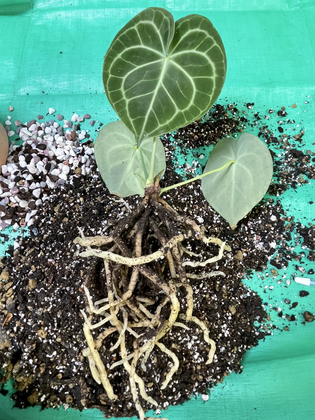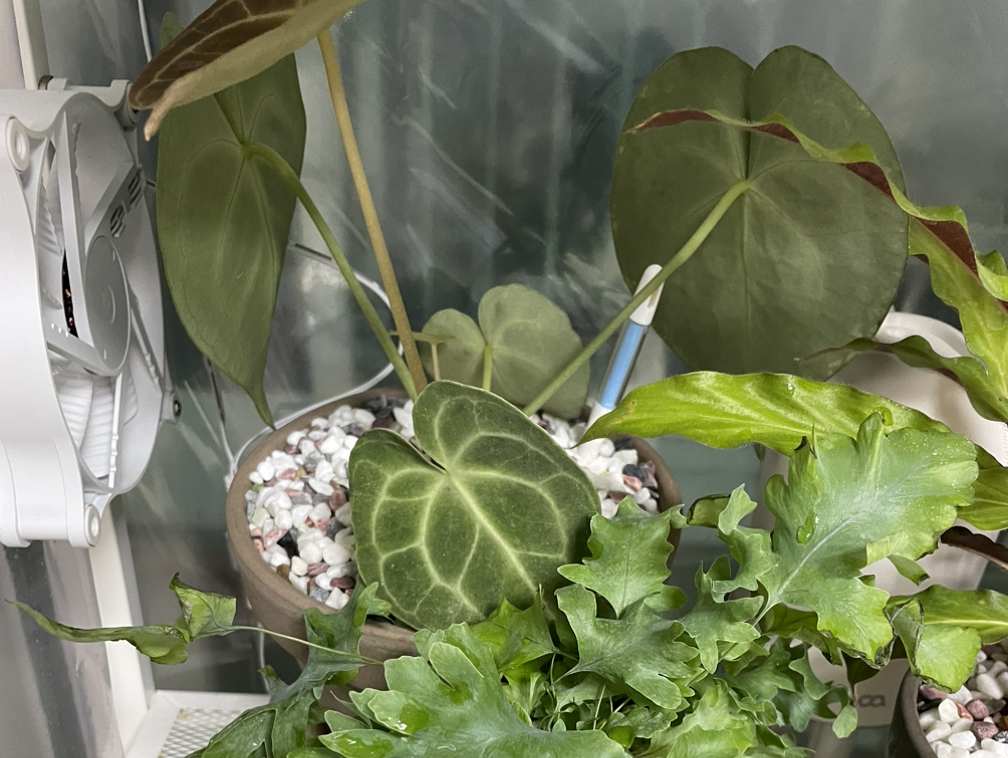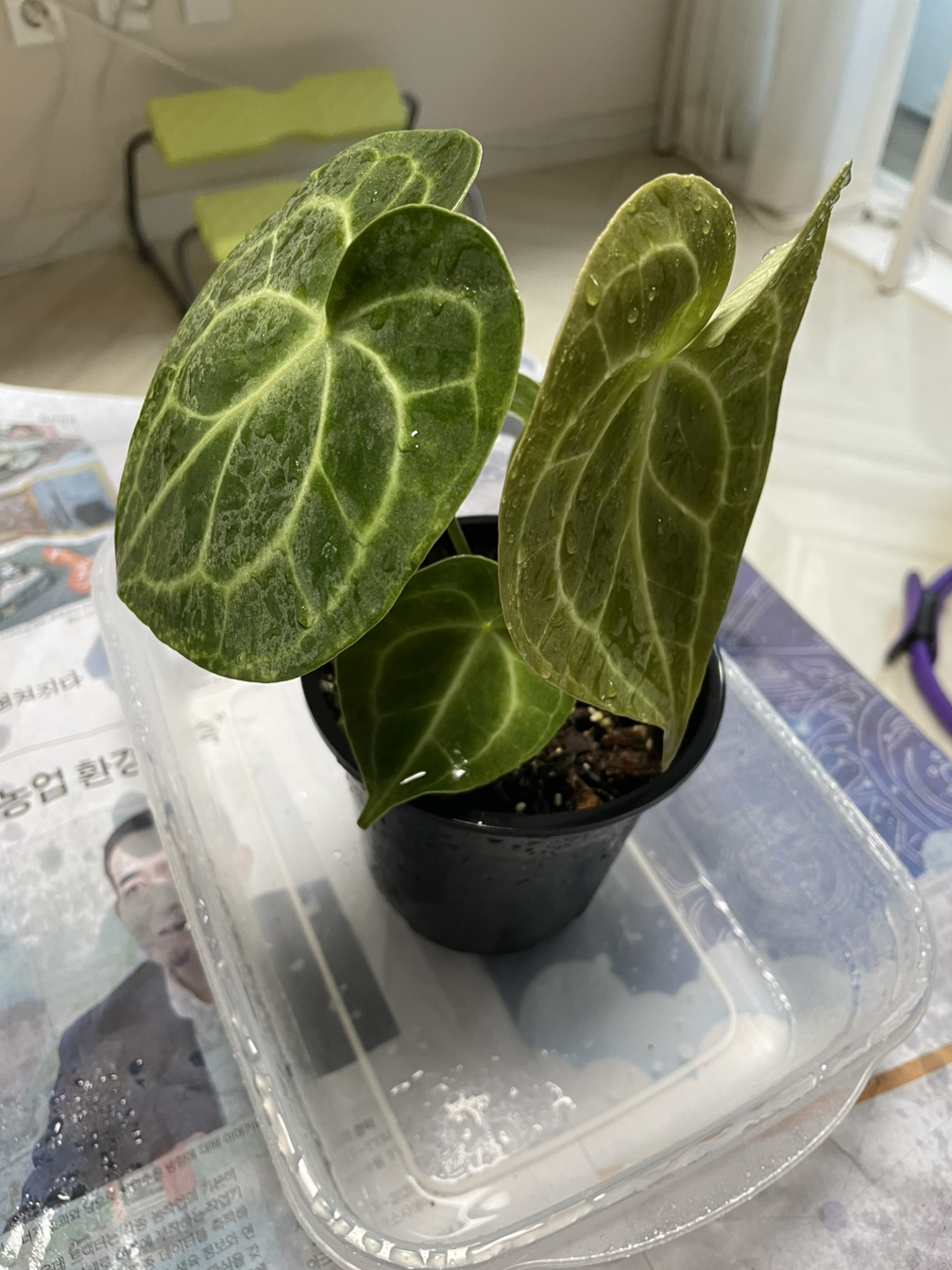 마침 들어온지 몇 달 되지 않은 안스리움 포게티가 너무 폭발적으로 커서 레르베리 제일 밑칸을 뚫고 나갈 기세였고, 이상기후로 베란다도 너무 더웠기에 더위에 취약한 친구들을 위한 피서공간을 거실에 만들어줘야 했다. 그래서 과도하게 실한 뿌리를 위해 화분 사이즈를 키워주고 거실내에 만든 새 온실에 넣어줬더니, 며칠 되지 않아 새 잎을 뽑기 시작했다. 야, 너 안 죽는구나!