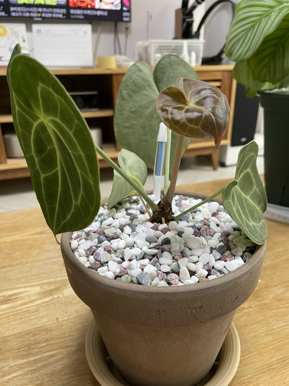 안스리움 클라리네비움은 고작 돈 십만원으로 인간의 간사함을 체험하게 해 주었다. 그래도 영상이나 식물마켓에 가면 있는 유묘보다, 어느정도 큰 사이즈의 실물(이라고 해도 흔한 식물이면 만원짜리 모종 사이즈지만)이 훨씬 귀엽긴 하다. 빵떡한 정하트 모양과 가죽 느낌의 잎 질감이 주는 매력이 사랑스럽다고 느껴지는 건, 아마 가격 때문만은 아닐 것이다.