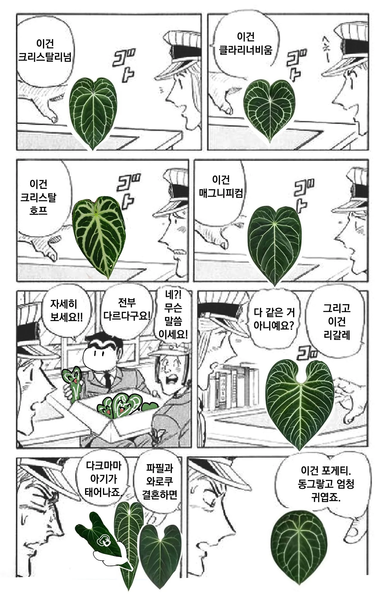 +) 원예용으로 개량된 안스리움과 요즘 희귀식물로 유통되는 안스리움은 같은 속의 식물이라고 한다. 당시 사람들이 꽃을 좋아했기에 꽃받침잎을 유전적으로 개량해 예쁘게 보이게 만든 것이 안시리움이라고도 불리는 흔한 원예용 안스리움이다. 현재는 원종 쪽이 잎을 관상하는 희귀식물로 더 높은 값을 쳐주게 된 점이 재미있다.