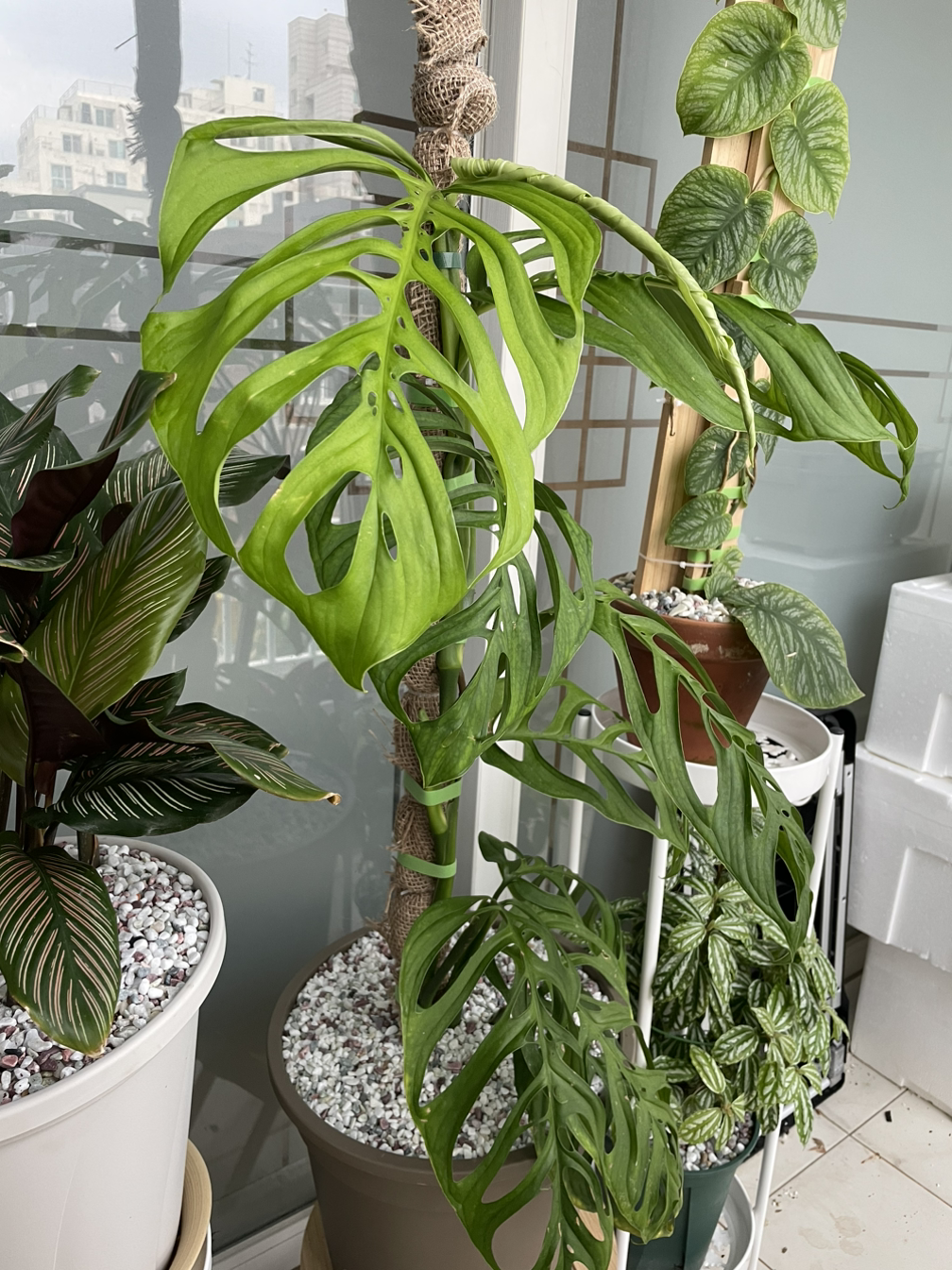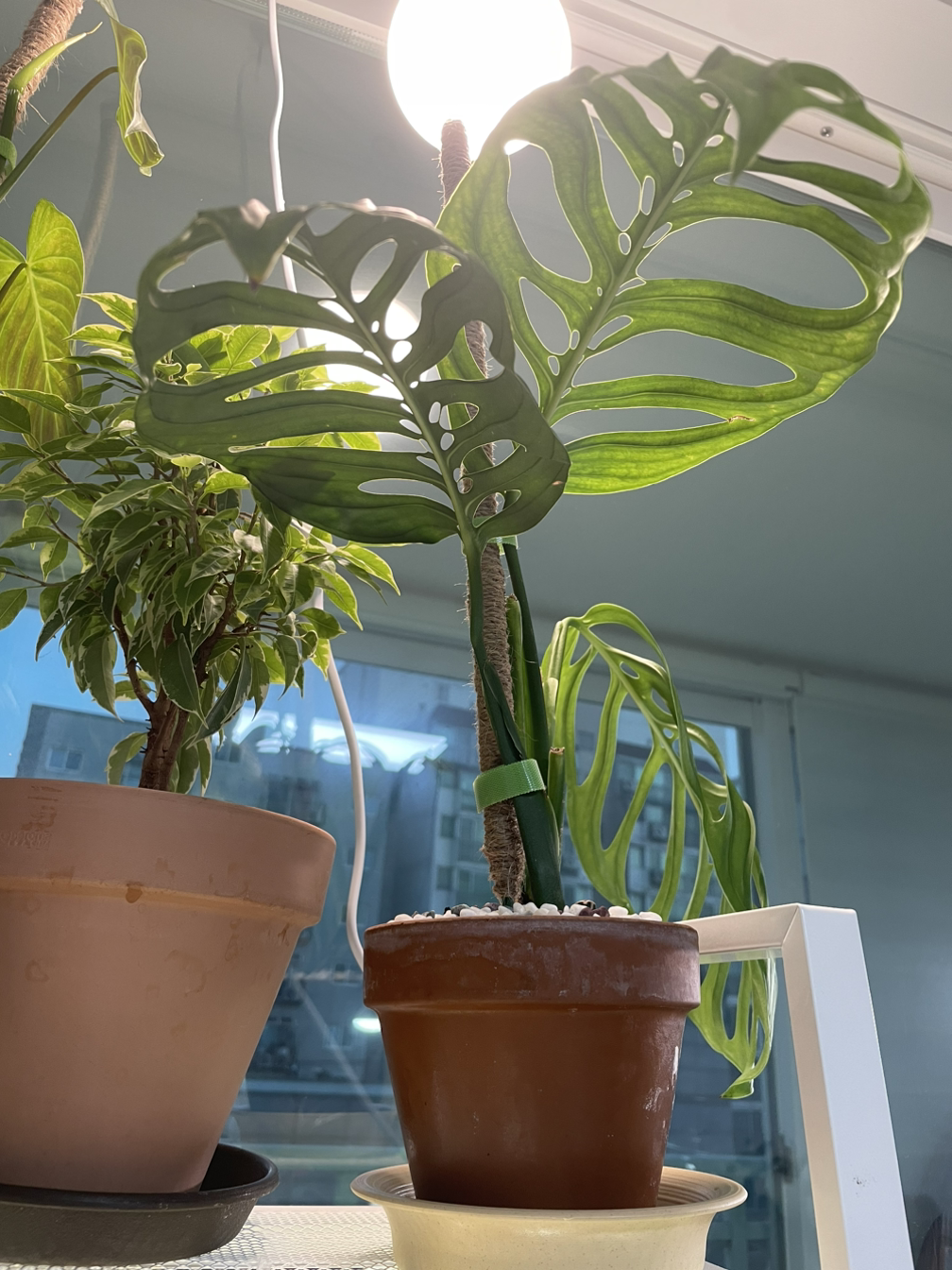 몬스테라는 단시간에 여러분의 주거 공간을 전부 잡아먹을 수 있는 식물입니다. 들일 때 신중합시다….(분명 12cm화분에도 다 안 차는 소품을 샀는데, 반 년만에 벵갈이를 제치고 최대 크기 화분(34cm)을 차지하셨다.)