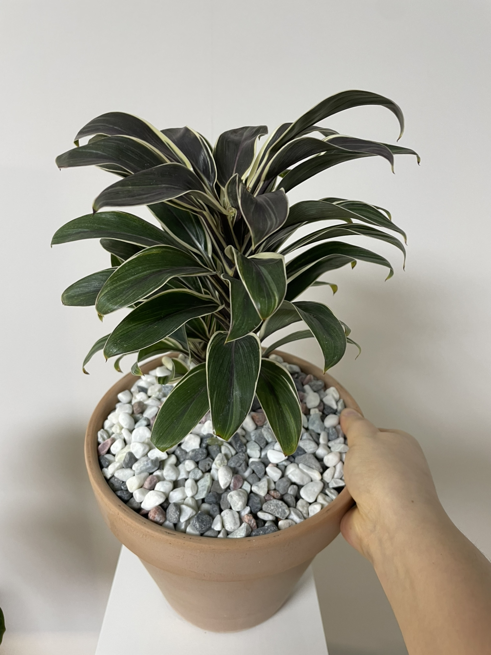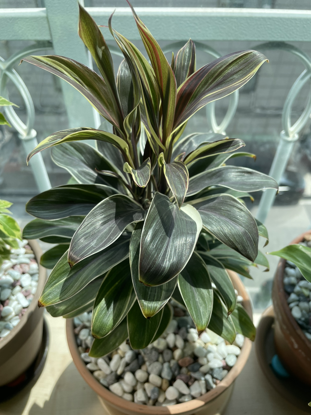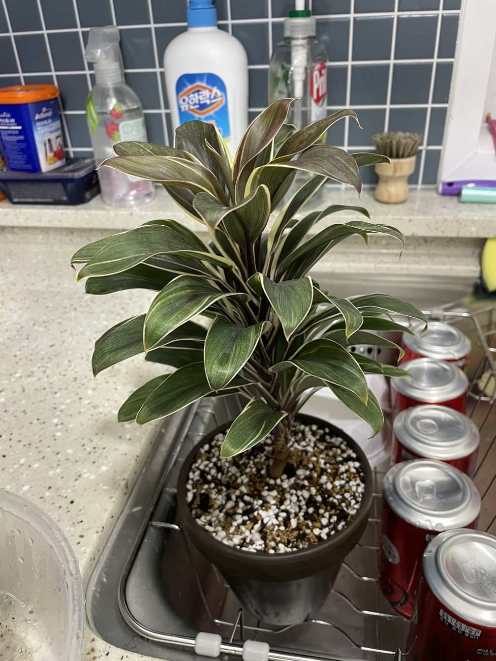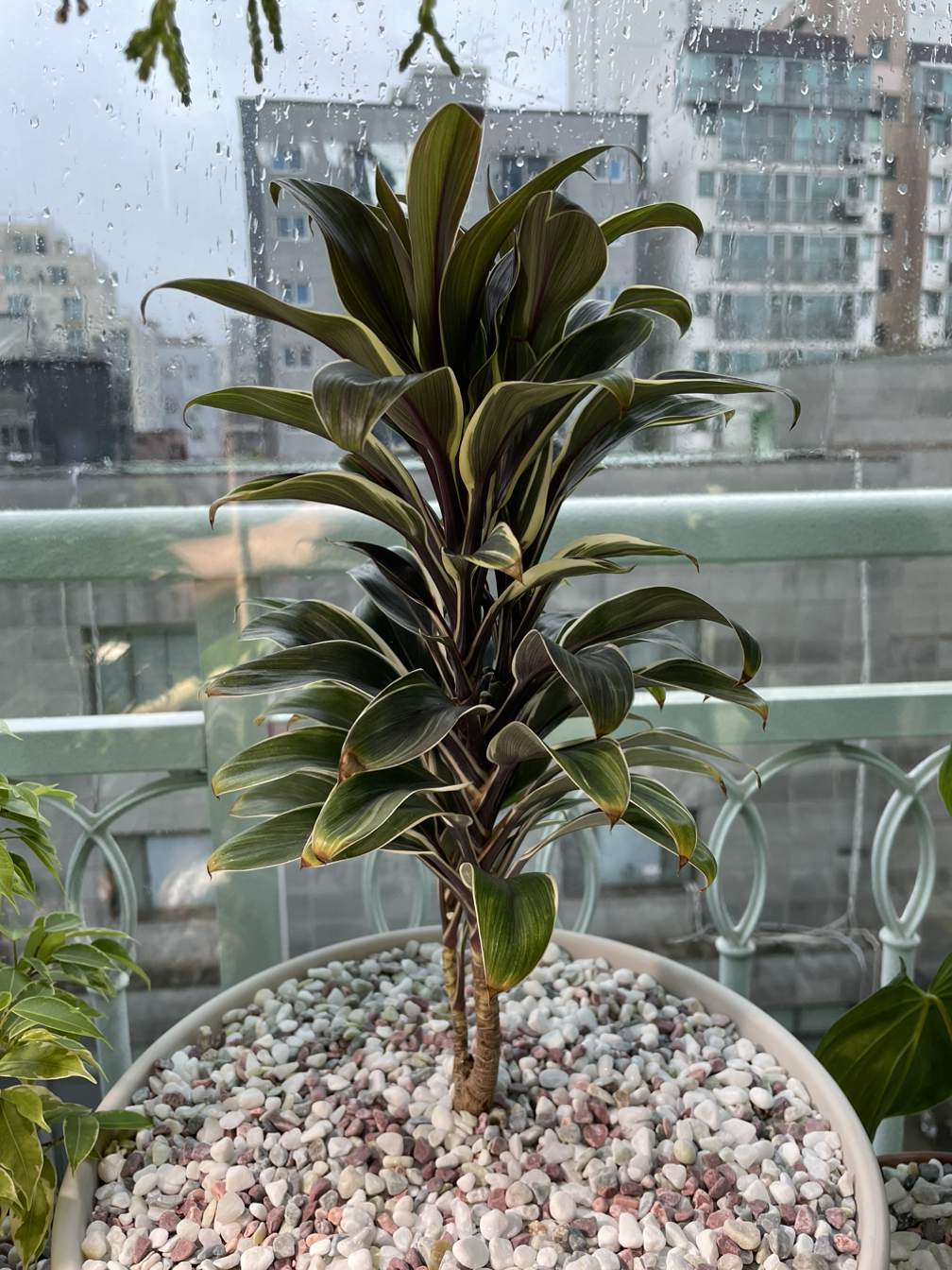 갈색과 여러 가지 색이 어우러진 이파리가 예쁜 코르딜리네 초콜릿퀸은 날 상당히 애먹인 식물이다. 칼라데아라는 이름으로도 가끔 유통이 되지만, 사실 유전적으로는 칼라데아랑 큰 상관은 없는 모양이다. 다만 토양 상태가 잘 맞으면 칼라데아처럼 폭발적으로 뿌리가 자라지만, 안 맞으면 새순이 나오는 그 상태로 딱딱하게 말라서 그 다음 새순도 못나오게끔 막아버리는 상태가 된다. 영어로 구글링을 해보니 무려 “코르딜리네 협회”라는 사이트가 있었고 사이트는 90년대에 만들어진 듯한 폼을 자랑했지만 아무튼 토양이 안 맞아서 수분을 빨아들이지 못하면 그런 상태가 된다고 하는 답을 얻을 수 있었다.(아니 왜 다시 그 사이트를 찾으려니 안 찾아지는 거죠;;) 그리고 은근히 햇빛을 많이 요구해! 사실 하와이 같은 데서는 노지에서도 자란다고 한다. hawaiian Ti plant라는 이름으로도 불리고 있다고.