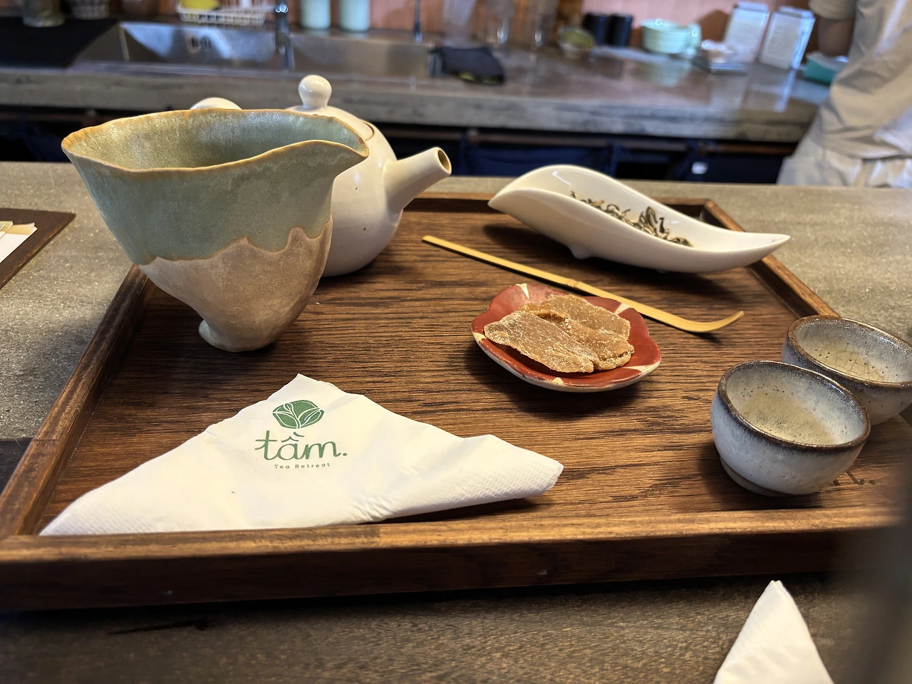 그리고 따뜻한 차로 co thu차를 시킨 뒤 어떤 기물로 어떻게 우리는 지 열심히 봤다. 말린 생강을 티푸드로 주셨고 정갈한 다기에 우려주심.