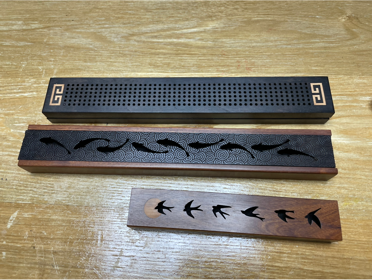 타고 남은 재가 처리하기 귀찮은 사람들을 위한 형태도 있다. 이 나무갑 안에는 타지 않는 부직포 같은 것이 들어있어서 안에 눕혀서 향을 태우고 난 뒤 재를 버리기만 하면 된다. 향이 잘 꺼져서 이것도 이것 나름대로 귀찮을 때가 있긴 하지만.