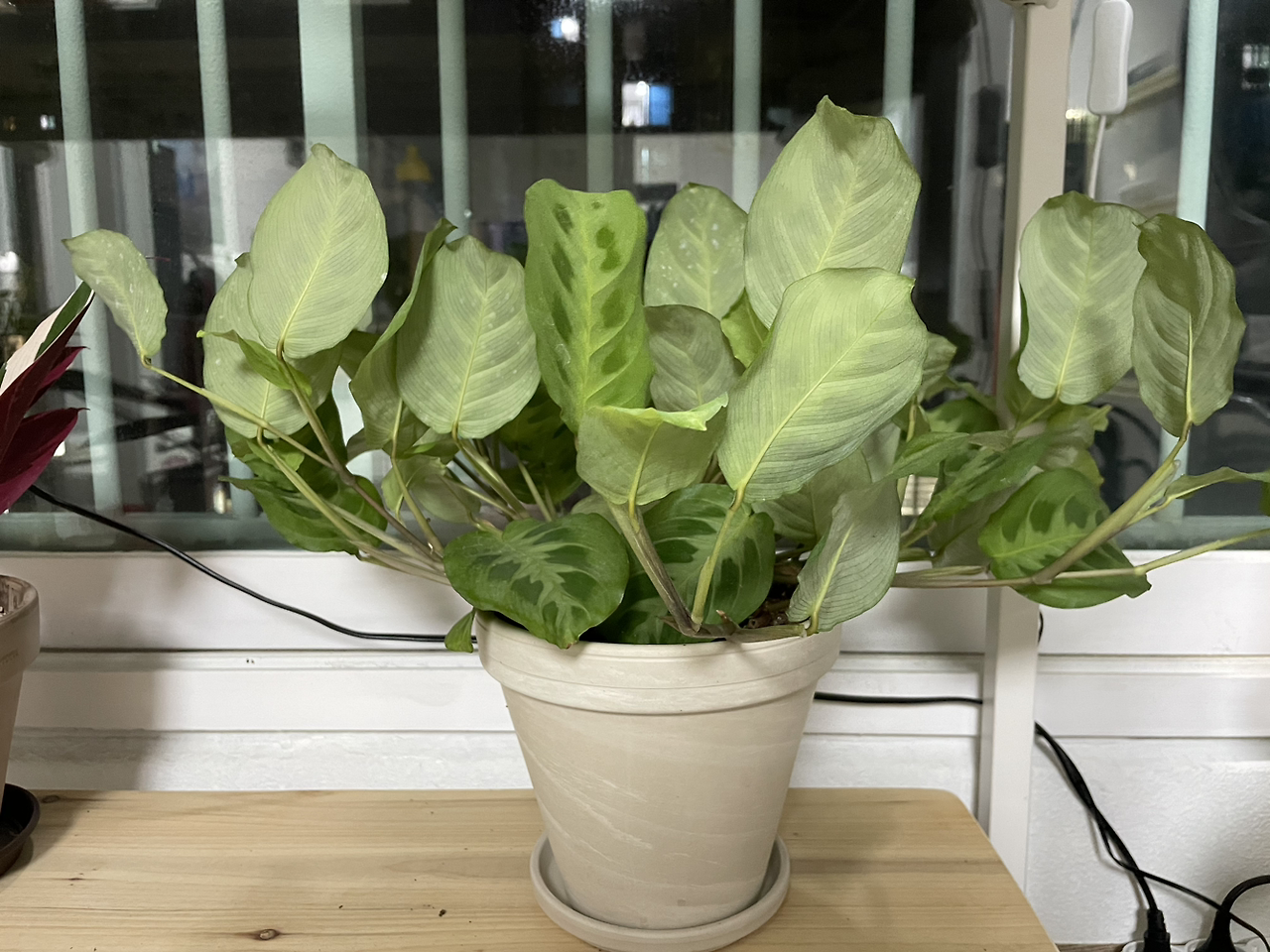 빛을 잘 못보는 자리에 있던 이 식물은 그래도 빛이 좀 들어오는 베란다에 들어오자 낮밤에 따라 펼쳐지고 오므려지는 활동을 시작했다. 칼라데아를 포함한 마란타과 식물들은 낮에는 햇빛을 보기 위해 잎을 펼치고, 밤에는 수분을 보전하고 자신을 보호하기 위해 오므려 “기도하는 식물“이라는 별명으로 알려져 있다.