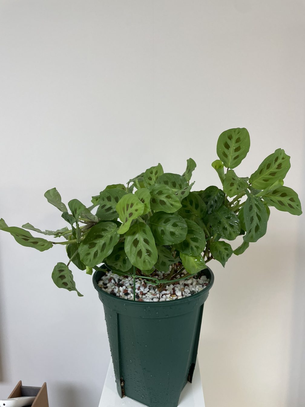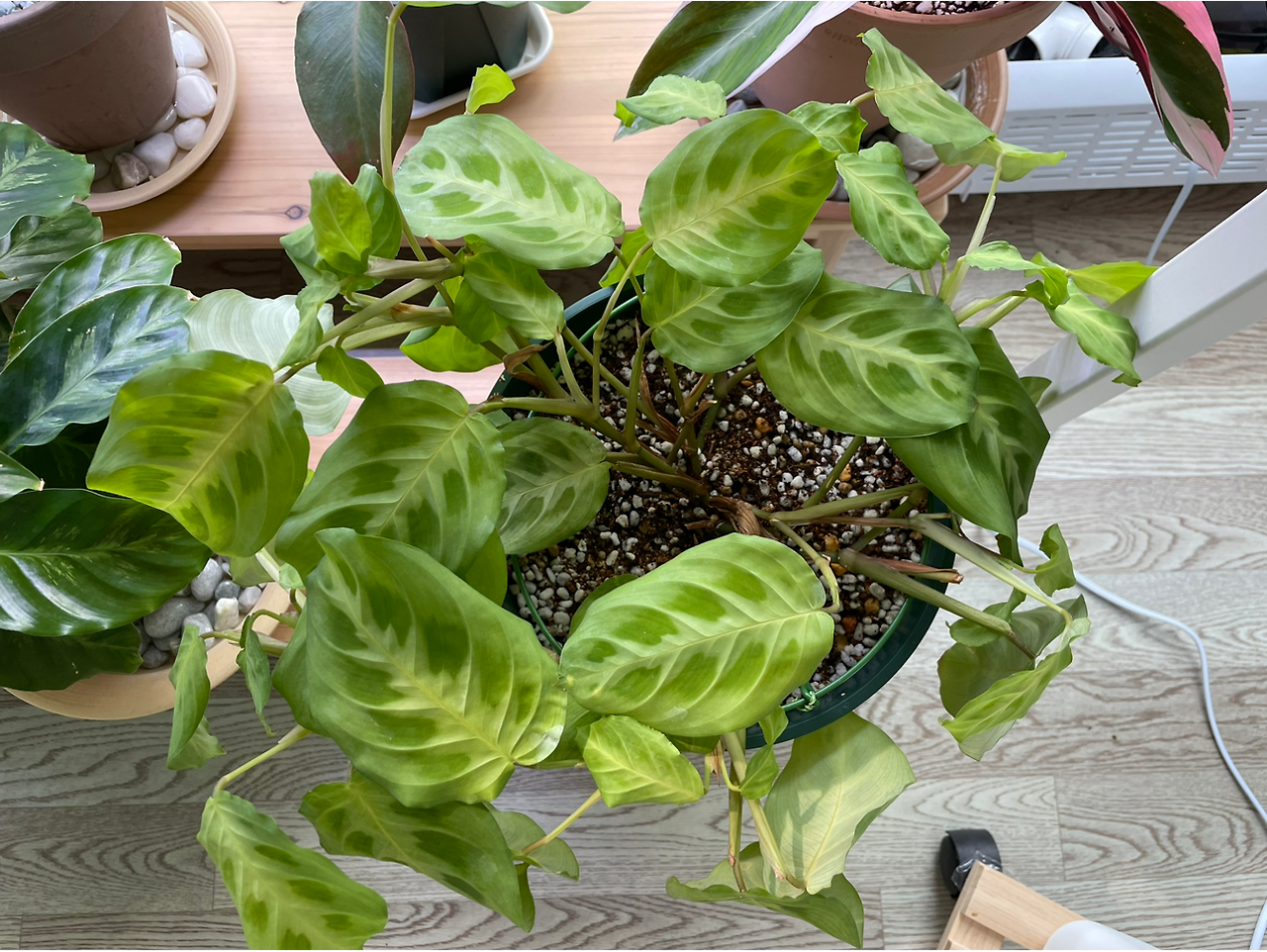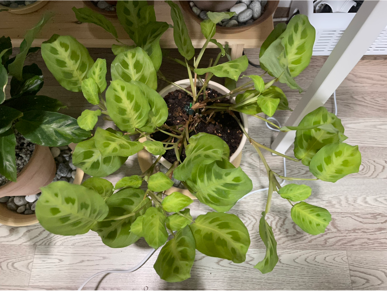 마란타는 키가 그다지 크지 않는 대신 땅을 기는 덩굴성 가지들이 많이 생기면서 옆으로 늘어지며 풍성해지는 식으로 성장한다. 마치 잡초같은 성장력으로 무섭게 새 잎을 가지마다 두어개씩 돌돌 말고 나와댔다. 그나마 이 친구가 마란타 중 가장 유명한 종처럼 무늬 색이 화려하지 않아 다행이었다.