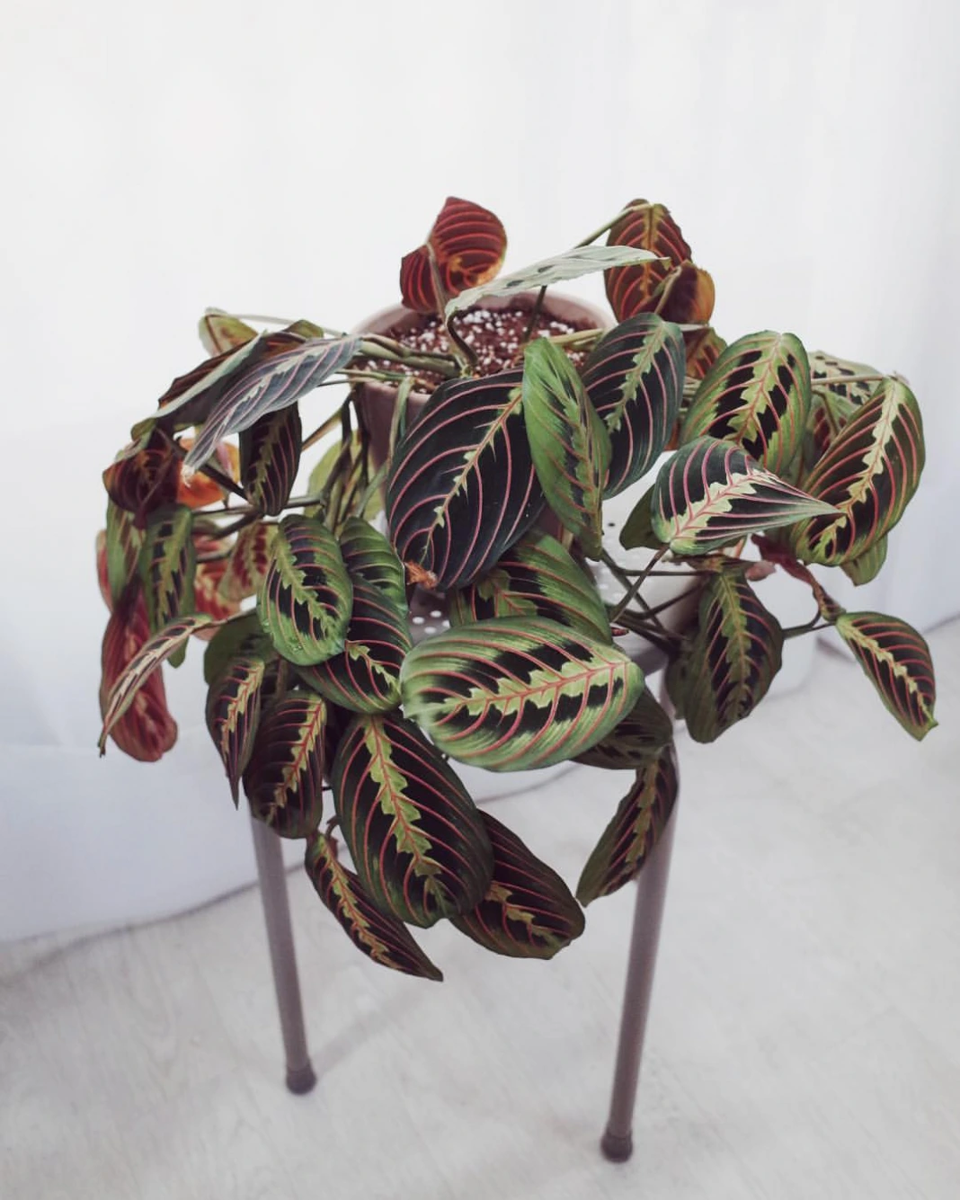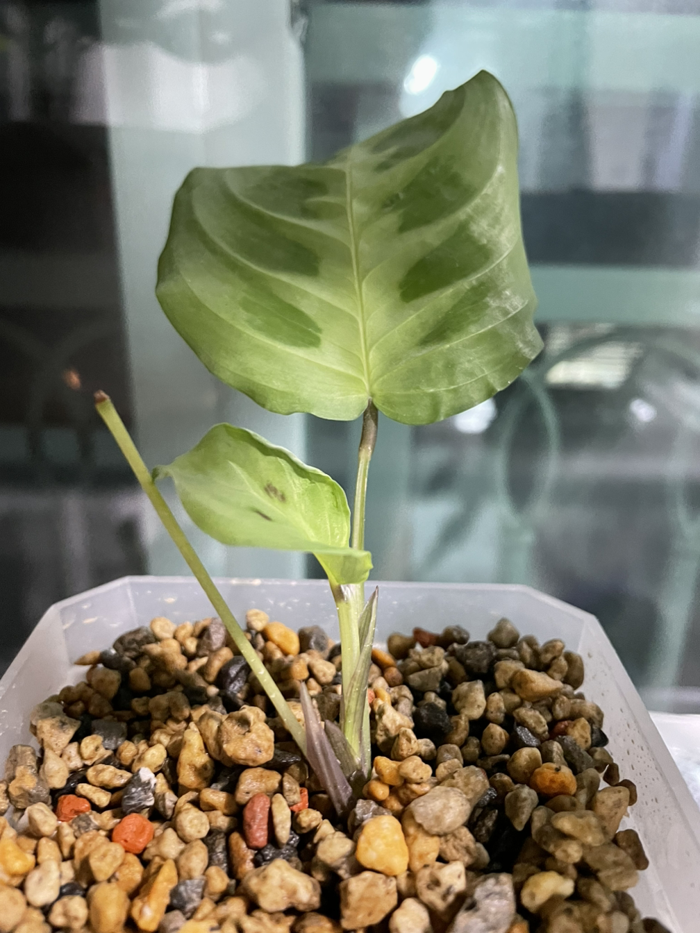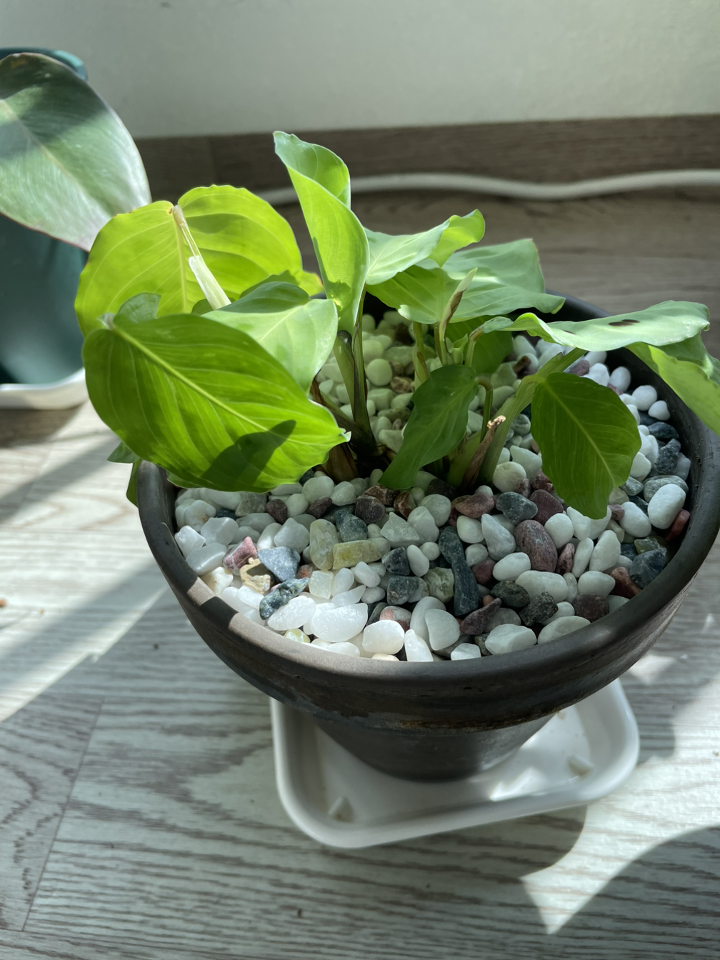 마란타는 키가 그다지 크지 않는 대신 땅을 기는 덩굴성 가지들이 많이 생기면서 옆으로 늘어지며 풍성해지는 식으로 성장한다. 마치 잡초같은 성장력으로 무섭게 새 잎을 가지마다 두어개씩 돌돌 말고 나와댔다. 그나마 이 친구가 마란타 중 가장 유명한 종처럼 무늬 색이 화려하지 않아 다행이었다.