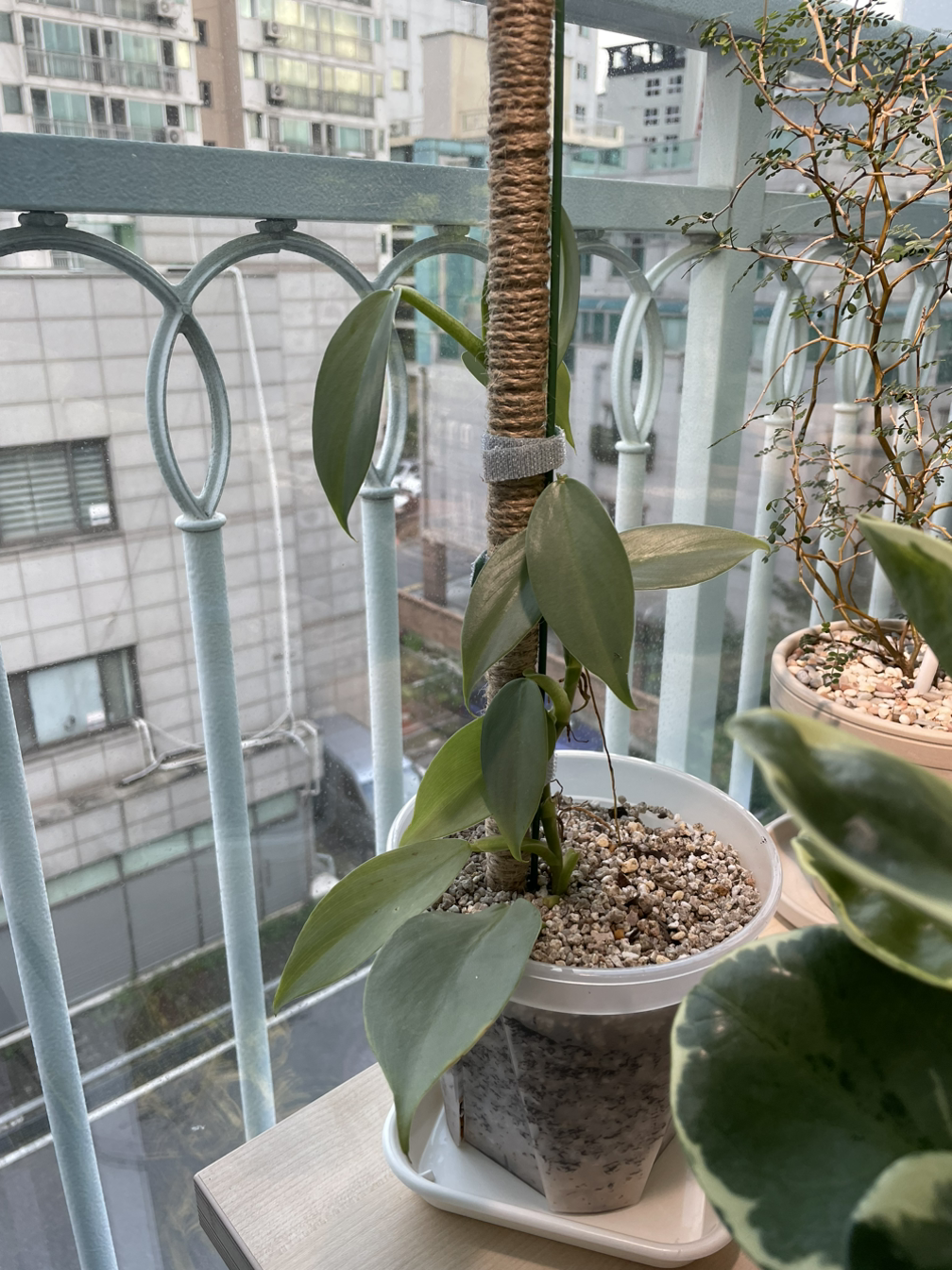 1미터 정도의 지지대를 다 오르면, 줄기에서 공중뿌리를 유도한 뒤 긴 아랫쪽 줄기 부분을 흙에 묻어(휘묻이) 한번 키를 줄이고 뿌리 부분을 좀 튼실하게 해볼 계획이다. 이제는 더 큰 개체를 5천원에 살 수 있으니 새 식물을 사서 합식이라도 해볼까도 생각했지만, 그렇게까지 하고 싶지는 않고. 자기 자신의 성장 속도가 있겠지 한다. 이런 초보의 손에서… 살아남은 것이 어디인가. 한편 이 식물은 필로덴드론 실버메탈 또는 실버스워드라는 이름으로 머나먼 한국의 원예 시장에서 5천원에 살 수 있는 흔한 식물이 되었지만, 자생지에서는 사람들이 원예용으로 하도 채취한 역사가 있어 멸종 위기 식물이 되었다고 한다. 우리집에서 되는 데까지는… 열심히 자라주렴. 오늘도 못생기고 길다는 이유로 여기저기 떠밀려서 한 번의 자리이동을 했지만.